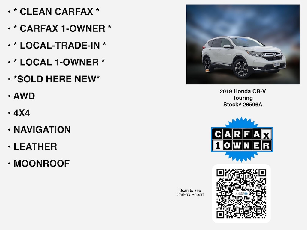 Disclaimer: Disclaimer: Program eligibility based on credit approval. Not all customers will qualify. Must finance through Ally Loan. Finance this 2019 Honda CR-V Touring (Model RW2H9KKNW, VIN 2HKRW2H99KH633378). Selling price $24,871.00, with $2,487.00 down at $386.48 for 72 months at 7.45% APR, on approved credit. Total payments: $27,826.56. $15.54 per $1,000 financed. Tax, title, license, and #DOCFEE dealer doc fee are extra. Offer assumes these paid at time of sale. Offer cannot be combined with any other offers. Residential restrictions may apply. Available on in-stock units only. See dealer for complete details. Offer Expires: 01/31/2026.