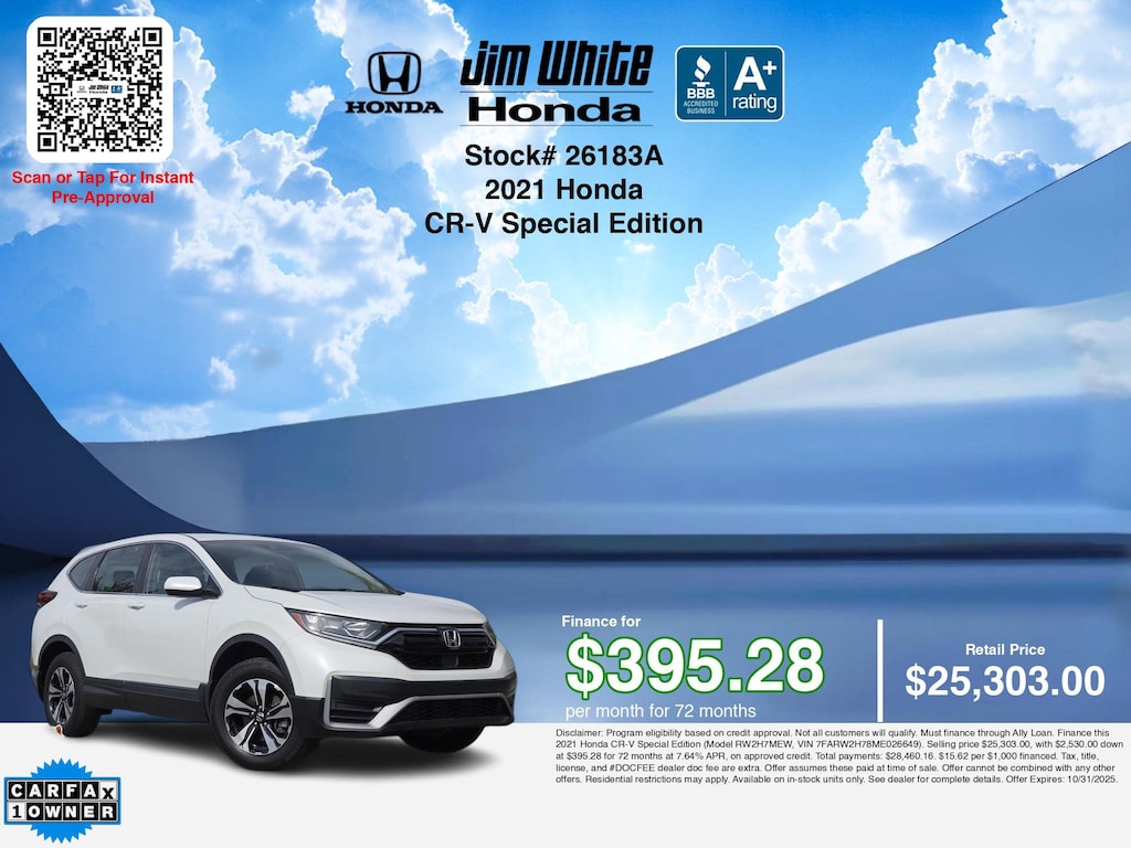 Disclaimer: Disclaimer: Program eligibility based on credit approval. Not all customers will qualify. Must finance through Ally Loan. Finance this 2021 Honda CR-V Special Edition (Model RW2H7MEW, VIN 7FARW2H78ME026649). Selling price $25,303.00, with $2,530.00 down at $395.28 for 72 months at 7.64% APR, on approved credit. Total payments: $28,460.16. $15.62 per $1,000 financed. Tax, title, license, and #DOCFEE dealer doc fee are extra. Offer assumes these paid at time of sale. Offer cannot be combined with any other offers. Residential restrictions may apply. Available on in-stock units only. See dealer for complete details. Offer Expires: 10/31/2025.