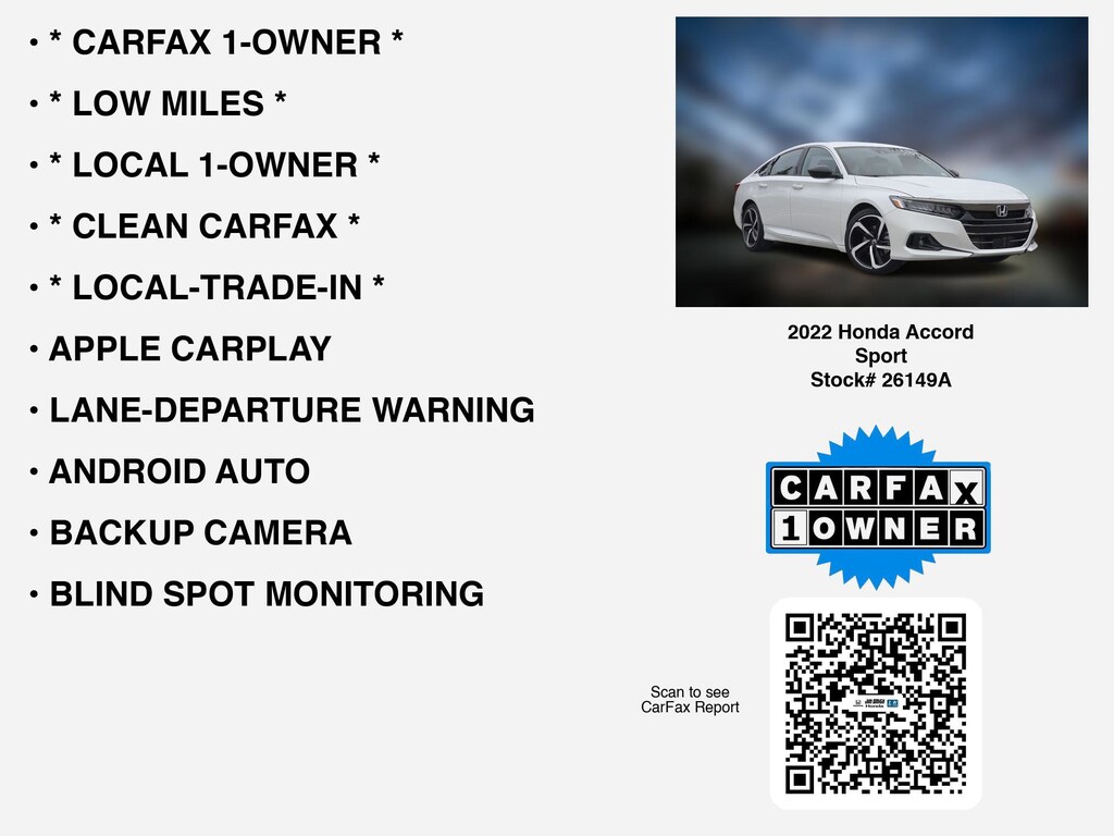 Please call 419-740-4925 anytime! for more info on this certified 2022 Honda Accord Sport.This car is equipped with premium features like * LOW MILES *, * LOCAL-TRADE-IN *, * LOCAL 1-OWNER *, * CLEAN CARFAX *, * CARFAX 1-OWNER *, APPLE CARPLAY, ANDROID AUTO, LANE-DEPARTURE WARNING, BLIND SPOT MONITORING, BACKUP CAMERA, TURBO, ALLOY-WHEELS, BLUETOOTH, usb, Remote entry, Fog Lamps that Toledo and Perrysburg drivers prefer.