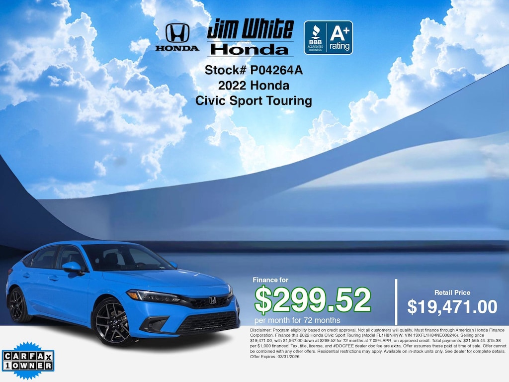 Disclaimer: Disclaimer: Program eligibility based on credit approval. Not all customers will qualify. Must finance through American Honda Finance Corporation. Finance this 2022 Honda Civic Sport Touring (Model FL1H8NKNW, VIN 19XFL1H84NE008246). Selling price $19,471.00, with $1,947.00 down at $299.52 for 72 months at 7.09% APR, on approved credit. Total payments: $21,565.44. $15.38 per $1,000 financed. Tax, title, license, and #DOCFEE dealer doc fee are extra. Offer assumes these paid at time of sale. Offer cannot be combined with any other offers. Residential restrictions may apply. Available on in-stock units only. See dealer for complete details. Offer Expires: 03/31/2026.