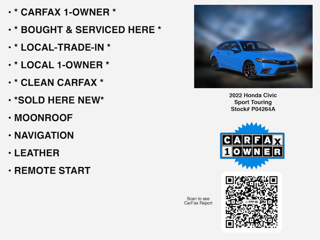 Please call 419-740-4925 anytime! for more info on this certified 2022 Honda Civic Sport Touring.This car is equipped with premium features like * LOCAL 1-OWNER *, * BOUGHT & SERVICED HERE *, * CLEAN CARFAX *, * CARFAX 1-OWNER *, * LOCAL-TRADE-IN *, *SOLD HERE NEW*, MOONROOF, LEATHER, NAVIGATION, WIRELESS PHONE CHARGER, REMOTE START, APPLE CARPLAY, ANDROID AUTO, LANE-DEPARTURE WARNING, ALLOY-WHEELS, TURBO, BLIND SPOT MONITORING, HOMELINK, BACKUP CAMERA, GREAT COLOR COMBINATION, BACKUP-SENSORS, BLUETOOTH, SiriusXM, Remote entry, Fog Lamps, Dual Power Seats, usb that Toledo and Perrysburg drivers prefer.