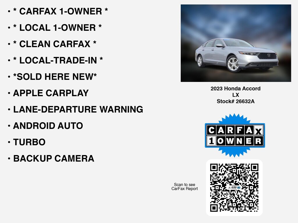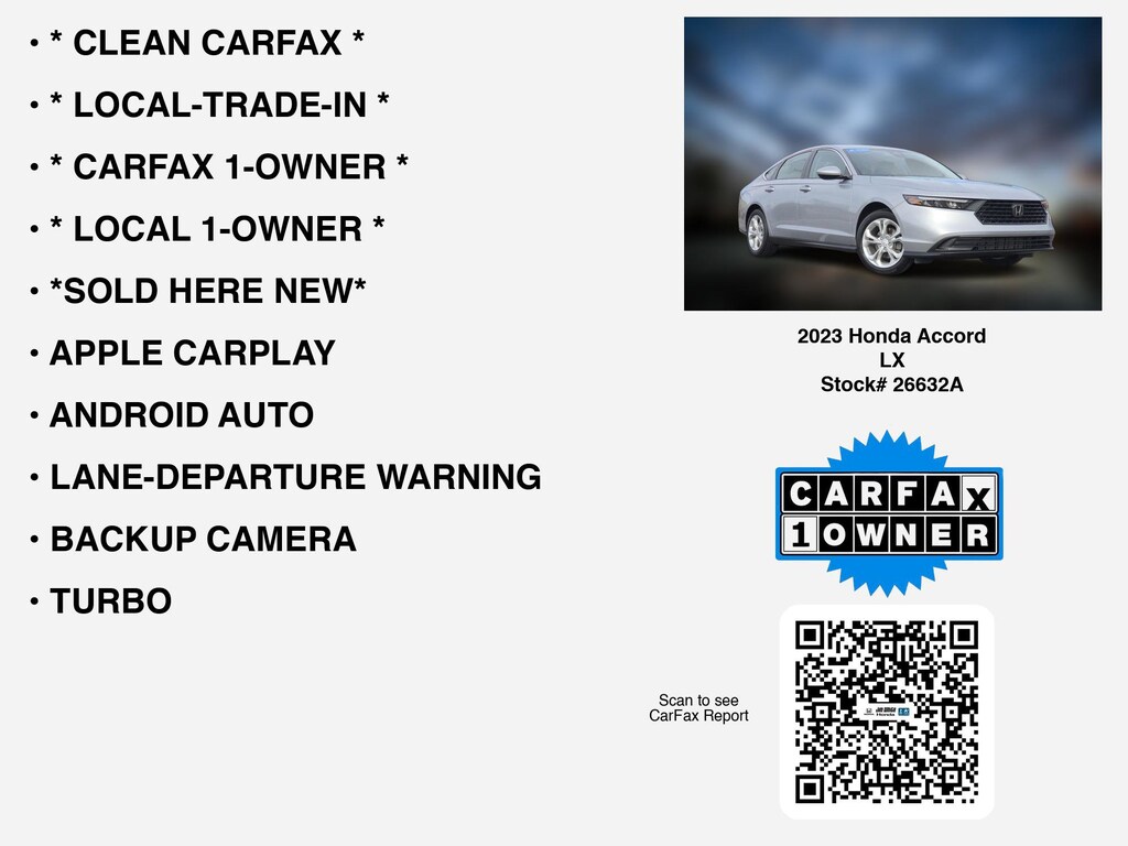 Please call 419-740-4925 anytime! for more info on this certified 2023 Honda Accord LX.This car is equipped with premium features like * LOCAL 1-OWNER *, * CLEAN CARFAX *, * LOCAL-TRADE-IN *, * CARFAX 1-OWNER *, *SOLD HERE NEW*, APPLE CARPLAY, LANE-DEPARTURE WARNING, ANDROID AUTO, TURBO, ALLOY-WHEELS, BACKUP CAMERA, GREAT COLOR COMBINATION, BLUETOOTH, WiFi Hotspot, Remote entry, usb that Toledo and Perrysburg drivers prefer.