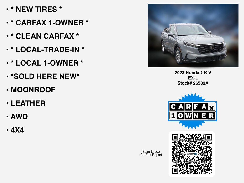 Please call 419-740-4925 anytime! for more info on this certified 2023 Honda CR-V EX-L car for sale. This vehicle is loaded with distinguished features like * CLEAN CARFAX *, * LOCAL 1-OWNER *, * LOCAL-TRADE-IN *, * NEW TIRES *, * CARFAX 1-OWNER *, *SOLD HERE NEW*, AWD, 4X4, MOONROOF, LEATHER, WIRELESS PHONE CHARGER, HEATED SEATS, REMOTE START, APPLE CARPLAY, ANDROID AUTO, LANE-DEPARTURE WARNING, BLIND SPOT MONITORING, TURBO, BACKUP CAMERA, REAR A/C, ALLOY-WHEELS, BLUETOOTH, BACKUP-SENSORS, Dual Power Seats, usb, Remote entry, SiriusXM that Toledo and Perrysburg drivers appreciate.