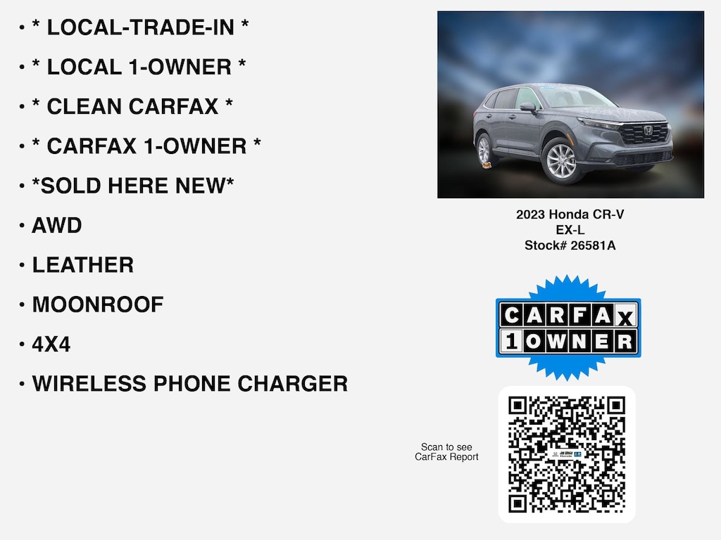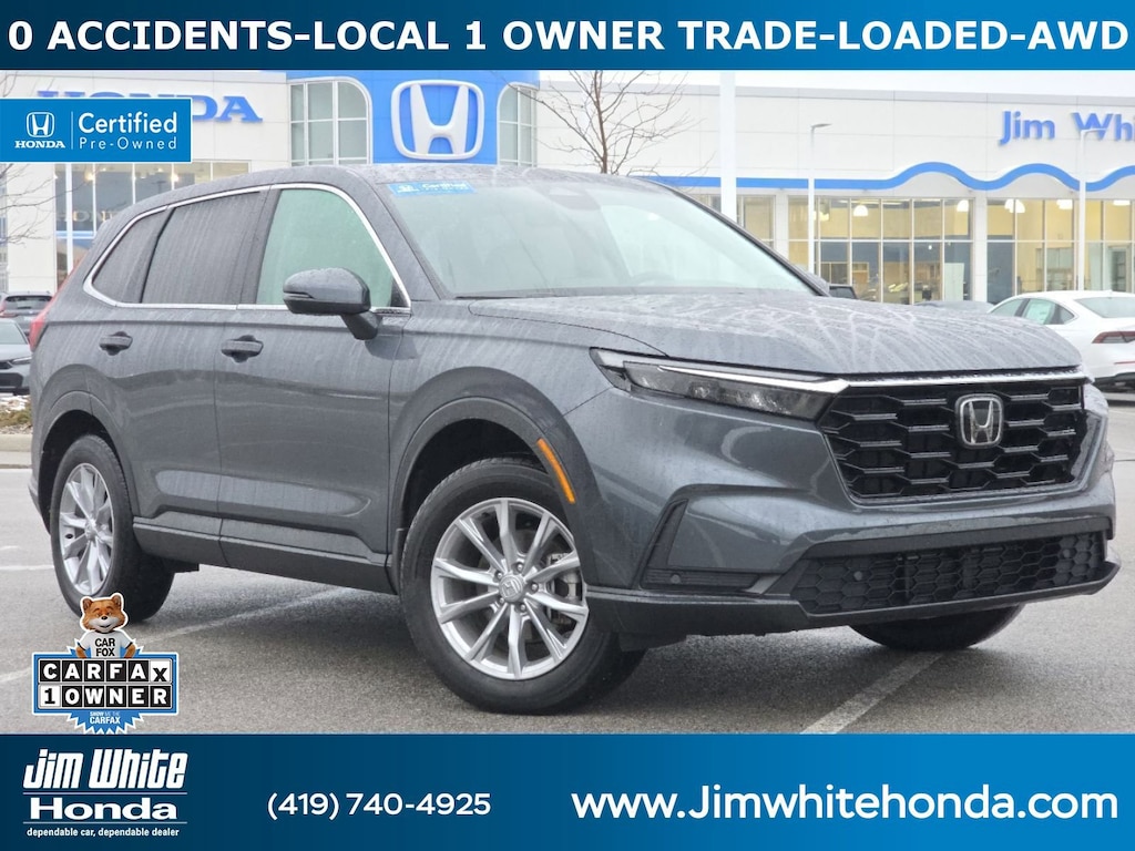 Please call 419-740-4925 anytime! for more info on this certified 2023 Honda CR-V EX-L car for sale. This vehicle is loaded with distinguished features like * CLEAN CARFAX *, * CARFAX 1-OWNER *, * LOCAL 1-OWNER *, * LOCAL-TRADE-IN *, *SOLD HERE NEW*, 4X4, MOONROOF, LEATHER, AWD, WIRELESS PHONE CHARGER, APPLE CARPLAY, REMOTE START, HEATED SEATS, ANDROID AUTO, LANE-DEPARTURE WARNING, TURBO, ALLOY-WHEELS, REAR A/C, BLIND SPOT MONITORING, BACKUP CAMERA, BACKUP-SENSORS, BLUETOOTH, usb, Remote entry, Dual Power Seats, SiriusXM that Toledo and Perrysburg drivers appreciate.