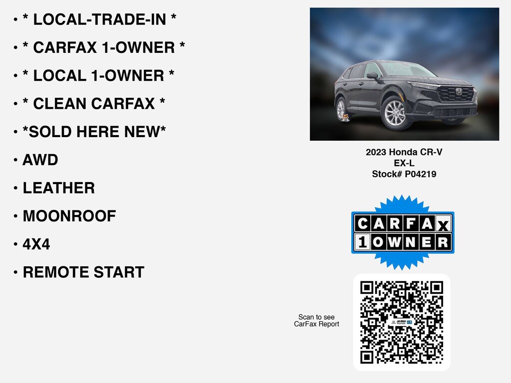 Please call 419-740-4925 anytime! for more info on this certified 2023 Honda CR-V EX-L.This car is equipped with premium features like * LOCAL 1-OWNER *, * LOCAL-TRADE-IN *, * CARFAX 1-OWNER *, * CLEAN CARFAX *, *SOLD HERE NEW*, 4X4, MOONROOF, LEATHER, AWD, HEATED SEATS, WIRELESS PHONE CHARGER, REMOTE START, APPLE CARPLAY, ANDROID AUTO, LANE-DEPARTURE WARNING, BACKUP CAMERA, TURBO, ALLOY-WHEELS, REAR A/C, BLIND SPOT MONITORING, BLUETOOTH, BACKUP-SENSORS, Remote entry, SiriusXM, Dual Power Seats, usb that Toledo and Perrysburg drivers prefer.