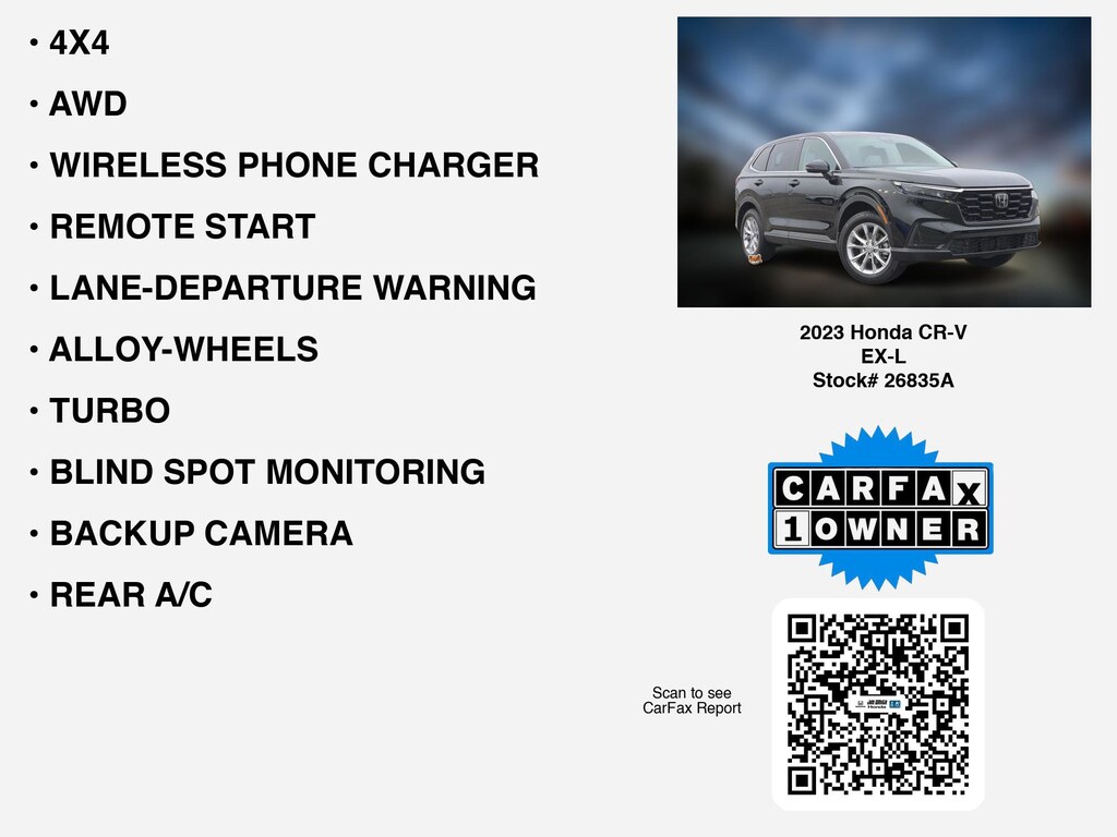 Please call 419-740-4925 anytime! for more info on this certified 2023 Honda CR-V EX-L car for sale. This vehicle is loaded with distinguished features like * LOCAL-TRADE-IN *, * LOCAL 1-OWNER *, * CARFAX 1-OWNER *, * BOUGHT & SERVICED HERE *, * CLEAN CARFAX *, *SOLD HERE NEW*, LEATHER, 4X4, AWD, MOONROOF, WIRELESS PHONE CHARGER, HEATED SEATS, REMOTE START, APPLE CARPLAY, LANE-DEPARTURE WARNING, ANDROID AUTO, BACKUP CAMERA, ALLOY-WHEELS, TURBO, BLIND SPOT MONITORING, REAR A/C, GREAT COLOR COMBINATION, BLUETOOTH, BACKUP-SENSORS, Remote entry, SiriusXM, Dual Power Seats, usb that Toledo and Perrysburg drivers appreciate.