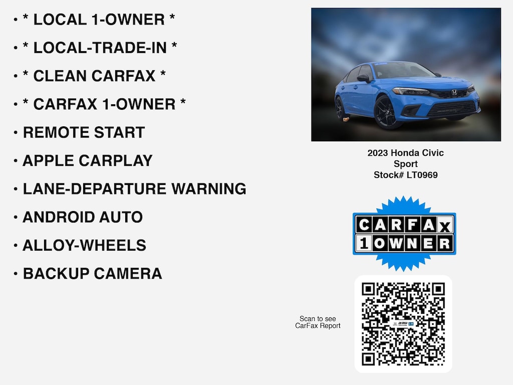 Please call 419-740-4925 anytime! for more info on this certified 2023 Honda Civic Sport.This car is equipped with premium features like * LOCAL-TRADE-IN *, * CLEAN CARFAX *, * LOCAL 1-OWNER *, * CARFAX 1-OWNER *, APPLE CARPLAY, REMOTE START, ANDROID AUTO, LANE-DEPARTURE WARNING, ALLOY-WHEELS, BACKUP CAMERA, GREAT COLOR COMBINATION, BLUETOOTH, Remote entry, usb that Toledo and Perrysburg drivers prefer.