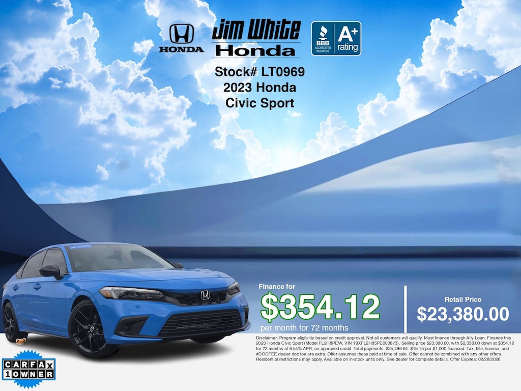 Disclaimer: Disclaimer: Program eligibility based on credit approval. Not all customers will qualify. Must finance through Ally Loan. Finance this 2023 Honda Civic Sport (Model FL2H8PEW, VIN 19XFL2H85PE003873). Selling price $23,380.00, with $2,338.00 down at $354.12 for 72 months at 6.54% APR, on approved credit. Total payments: $25,496.64. $15.15 per $1,000 financed. Tax, title, license, and #DOCFEE dealer doc fee are extra. Offer assumes these paid at time of sale. Offer cannot be combined with any other offers. Residential restrictions may apply. Available on in-stock units only. See dealer for complete details. Offer Expires: 02/28/2026.