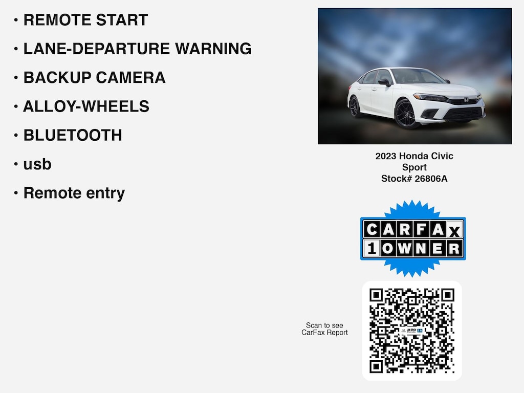 Please call 419-740-4925 anytime! for more info on this 2023 Honda Civic Sport. This Carfax 1 owner car for sale is packed with premium features like REMOTE START, LANE-DEPARTURE WARNING, ALLOY-WHEELS, BACKUP CAMERA, BLUETOOTH, usb, Remote entry that Toledo and Perrysburg drivers expect.