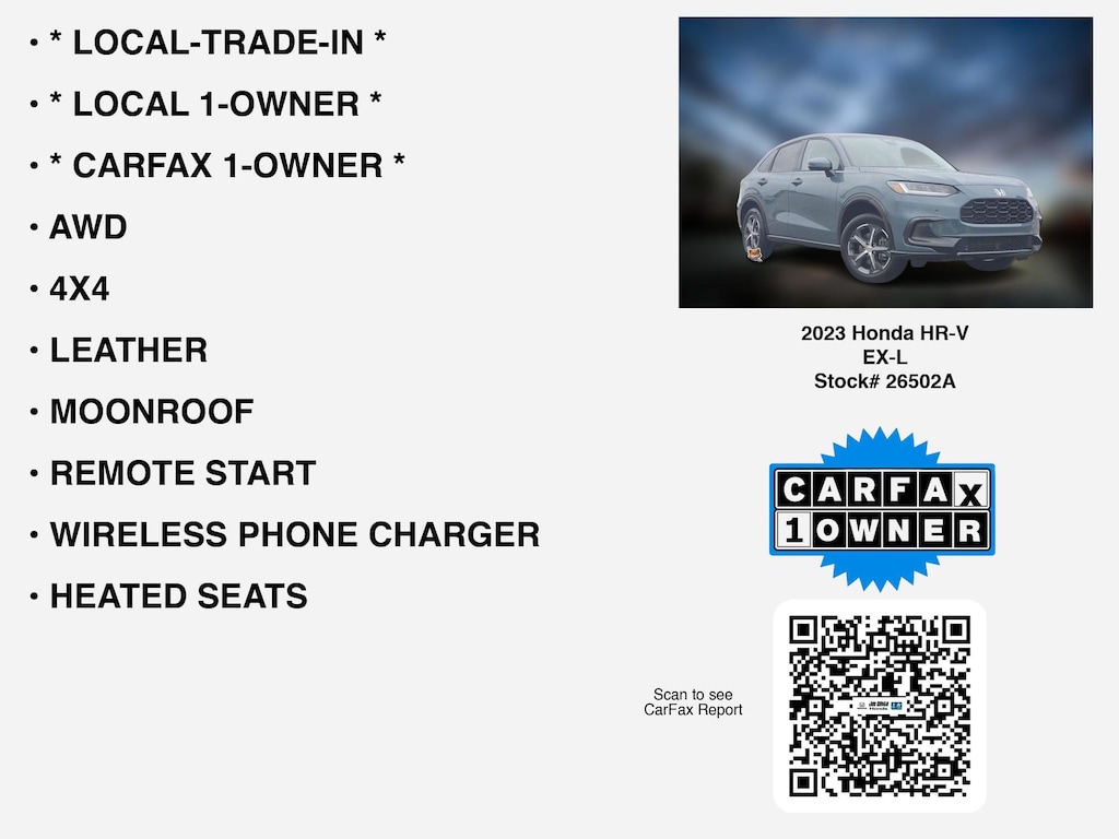 Please call 419-740-4925 anytime! for more info on this certified 2023 Honda HR-V EX-L.This car is equipped with premium features like * LOCAL-TRADE-IN *, * CARFAX 1-OWNER *, * LOCAL 1-OWNER *, 4X4, LEATHER, MOONROOF, AWD, APPLE CARPLAY, REMOTE START, HEATED SEATS, WIRELESS PHONE CHARGER, LANE-DEPARTURE WARNING, ANDROID AUTO, ALLOY-WHEELS, BACKUP CAMERA, BLIND SPOT MONITORING, BLUETOOTH, WiFi Hotspot, Remote entry, usb, SiriusXM that Toledo and Perrysburg drivers prefer.