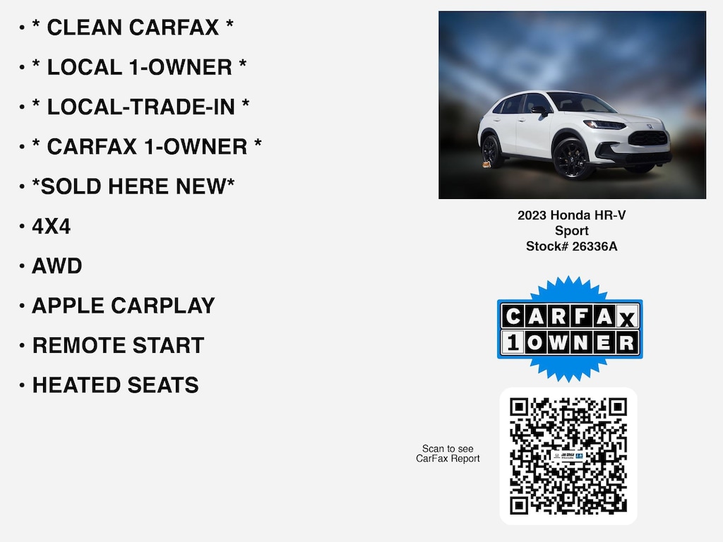 Please call 419-740-4925 anytime! for more info on this certified 2023 Honda HR-V Sport.This car is equipped with premium features like * LOCAL-TRADE-IN *, * CLEAN CARFAX *, * CARFAX 1-OWNER *, * LOCAL 1-OWNER *, *SOLD HERE NEW*, AWD, 4X4, HEATED SEATS, APPLE CARPLAY, REMOTE START, ANDROID AUTO, LANE-DEPARTURE WARNING, ALLOY-WHEELS, BACKUP CAMERA, BLIND SPOT MONITORING, BLUETOOTH, Remote entry, usb that Toledo and Perrysburg drivers prefer.