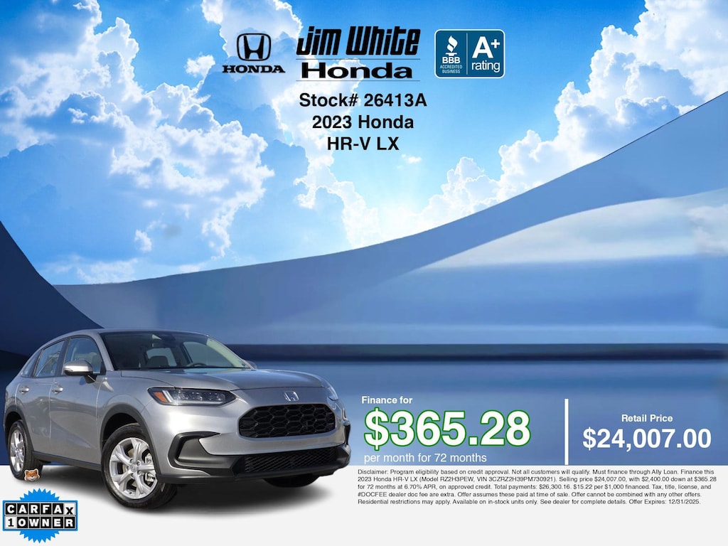 Disclaimer: Disclaimer: Program eligibility based on credit approval. Not all customers will qualify. Must finance through Ally Loan. Finance this 2023 Honda HR-V LX (Model RZ2H3PEW, VIN 3CZRZ2H39PM730921). Selling price $24,007.00, with $2,400.00 down at $365.28 for 72 months at 6.70% APR, on approved credit. Total payments: $26,300.16. $15.22 per $1,000 financed. Tax, title, license, and #DOCFEE dealer doc fee are extra. Offer assumes these paid at time of sale. Offer cannot be combined with any other offers. Residential restrictions may apply. Available on in-stock units only. See dealer for complete details. Offer Expires: 12/31/2025.