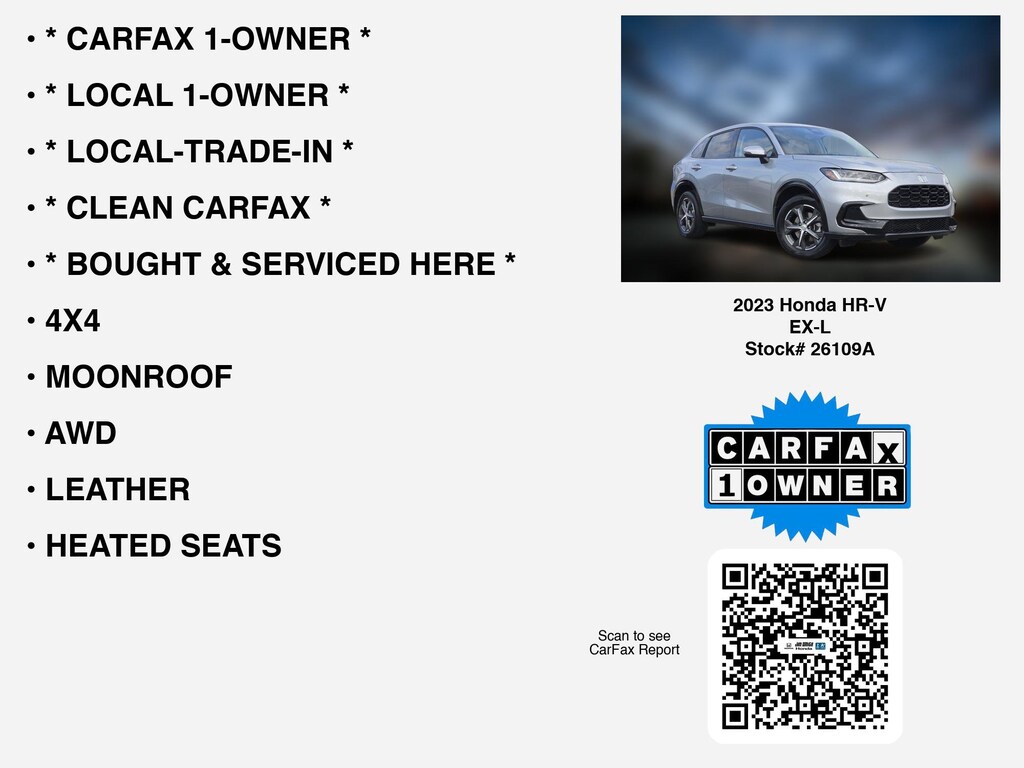 Please call 419-740-4925 anytime! for more info on this certified 2023 Honda HR-V EX-L car for sale. This vehicle is loaded with distinguished features like * LOCAL 1-OWNER *, * LOCAL-TRADE-IN *, * BOUGHT & SERVICED HERE *, * CLEAN CARFAX *, * CARFAX 1-OWNER *, MOONROOF, LEATHER, 4X4, AWD, REMOTE START, HEATED SEATS, APPLE CARPLAY, WIRELESS PHONE CHARGER, LANE-DEPARTURE WARNING, ANDROID AUTO, BLIND SPOT MONITORING, BACKUP CAMERA, ALLOY-WHEELS, BLUETOOTH, WiFi Hotspot, Remote entry, usb, SiriusXM that Toledo and Perrysburg drivers appreciate.