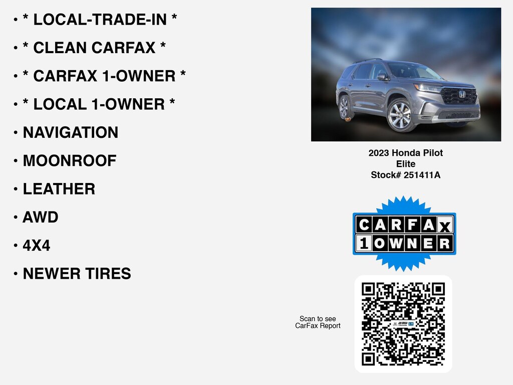 Please call 419-740-4925 anytime! for more info on this certified 2023 Honda Pilot Elite car for sale. This vehicle is loaded with distinguished features like * LOCAL-TRADE-IN *, * CARFAX 1-OWNER *, * CLEAN CARFAX *, * LOCAL 1-OWNER *, NEWER TIRES, AWD, NAVIGATION, LEATHER, 4X4, MOONROOF, 360 CAM, 3RD ROW SEAT, APPLE CARPLAY, COOLED SEATS, REMOTE START, HEATED SEATS, WIRELESS PHONE CHARGER, HEADS-UP DISPLAY, ANDROID AUTO, HEATED-REAR SEATS, LANE-DEPARTURE WARNING, REAR A/C, BACKUP CAMERA, HEATED-STEERING WHEEL, BLIND SPOT MONITORING, ALLOY-WHEELS, HOMELINK, BACKUP-SENSORS, STOW "N GO, BLUETOOTH, WiFi Hotspot, usb, Dual Power Seats, SiriusXM, Fog Lamps, Remote entry that Toledo and Perrysburg drivers appreciate.