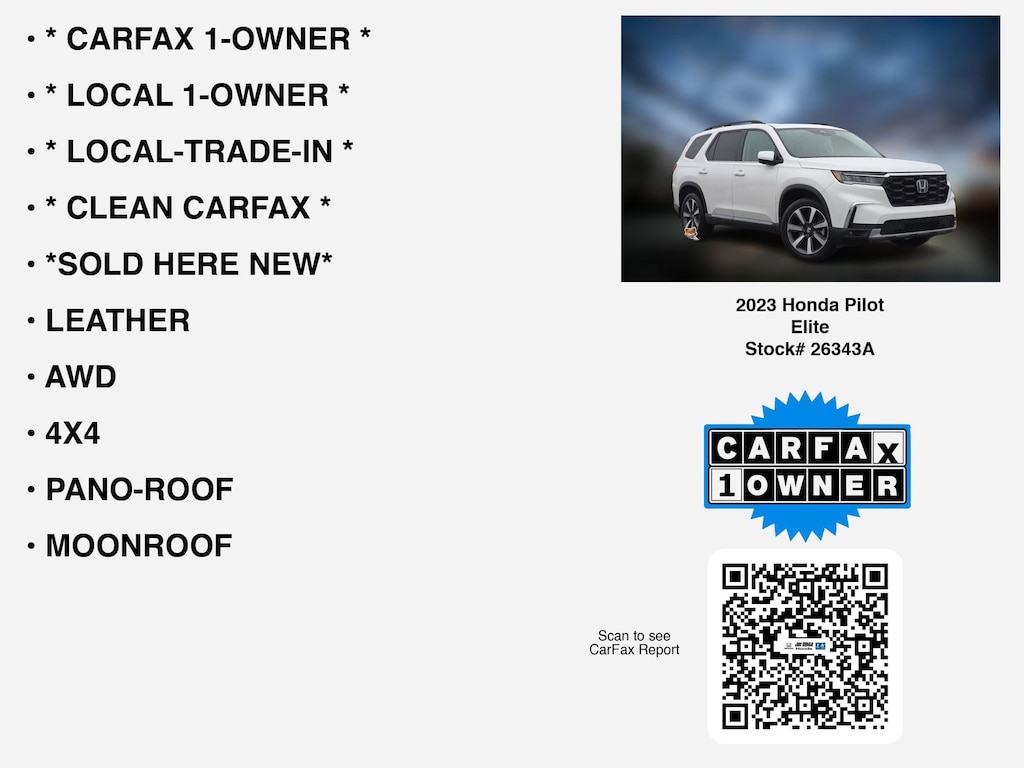 Please call 419-740-4925 anytime! for more info on this certified 2023 Honda Pilot Elite car for sale. This vehicle is loaded with distinguished features like * CLEAN CARFAX *, * LOCAL-TRADE-IN *, * CARFAX 1-OWNER *, * LOCAL 1-OWNER *, *SOLD HERE NEW*, MOONROOF, LEATHER, 4X4, AWD, NAVIGATION, PANO-ROOF, COOLED SEATS, HEADS-UP DISPLAY, 3RD ROW SEAT, APPLE CARPLAY, WIRELESS PHONE CHARGER, REMOTE START, 360 CAM, HEATED SEATS, LANE-DEPARTURE WARNING, ANDROID AUTO, HEATED-REAR SEATS, HONDA SENSING, BLIND SPOT MONITORING, REAR A/C, HOMELINK, HEATED-STEERING WHEEL, BACKUP CAMERA, ALLOY-WHEELS, BLUETOOTH, STOW "N GO, WiFi Hotspot, Remote entry, Fog Lamps, SiriusXM, usb, Dual Power Seats that Toledo and Perrysburg drivers appreciate.