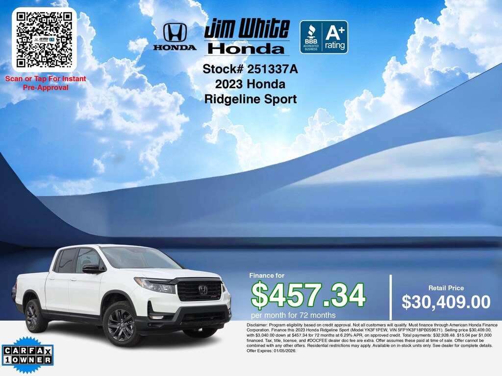 Disclaimer: Disclaimer: Program eligibility based on credit approval. Not all customers will qualify. Must finance through American Honda Finance Corporation. Finance this 2023 Honda Ridgeline Sport (Model YK3F1PEW, VIN 5FPYK3F18PB059671). Selling price $30,409.00, with $3,040.00 down at $457.34 for 72 months at 6.29% APR, on approved credit. Total payments: $32,928.48. $15.04 per $1,000 financed. Tax, title, license, and #DOCFEE dealer doc fee are extra. Offer assumes these paid at time of sale. Offer cannot be combined with any other offers. Residential restrictions may apply. Available on in-stock units only. See dealer for complete details. Offer Expires: 01/05/2026.