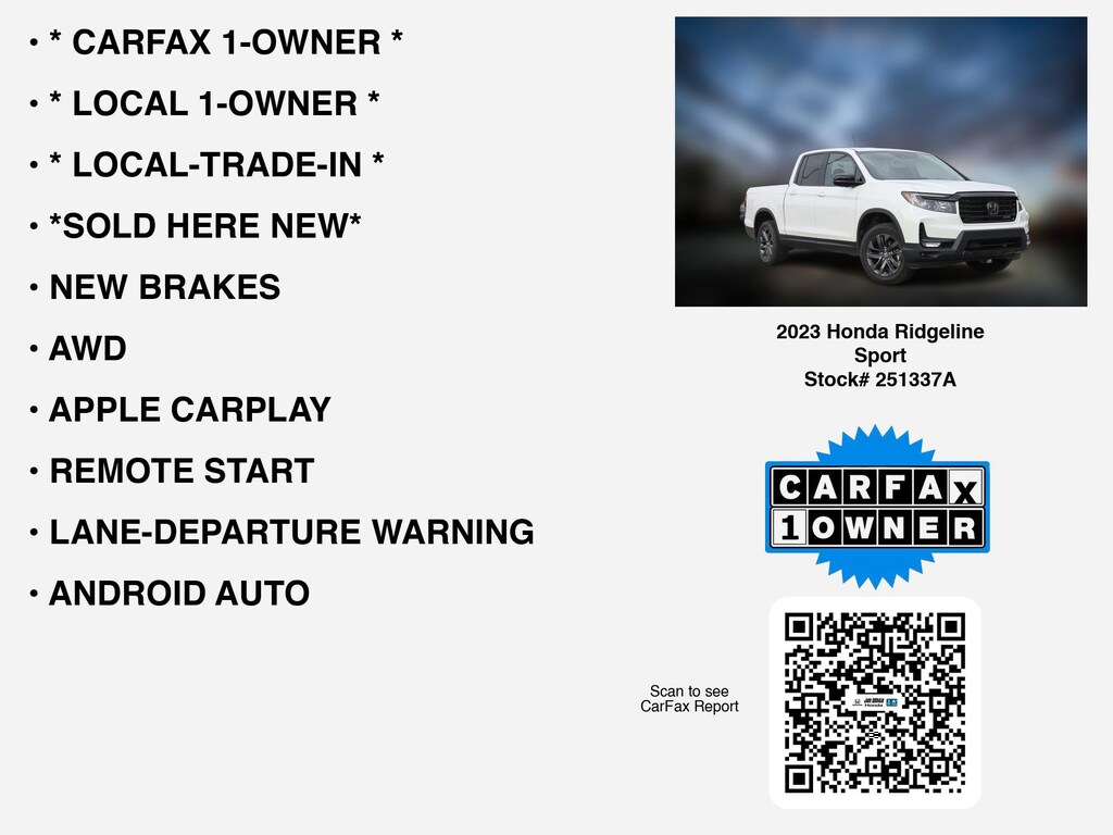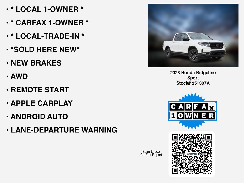Please call 419-740-4925 anytime! for more info on this certified 2023 Honda Ridgeline Sport.This car is equipped with premium features like * LOCAL 1-OWNER *, * CARFAX 1-OWNER *, * LOCAL-TRADE-IN *, *SOLD HERE NEW*, AWD, NEW BRAKES, REMOTE START, APPLE CARPLAY, TOW PKG, LANE-DEPARTURE WARNING, ANDROID AUTO, ALLOY-WHEELS, HOMELINK, REAR A/C, BED-LINER, BACKUP CAMERA, CLEAN CARFAX, BLUETOOTH, WiFi Hotspot, Remote entry, usb, Fog Lamps that Toledo and Perrysburg drivers prefer.
