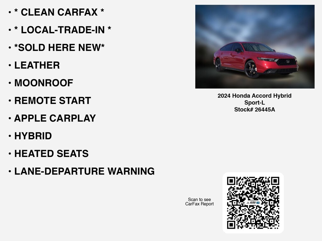 Please call 419-740-4925 anytime! for more info on this certified 2024 Honda Accord Hybrid Sport-L car for sale. This vehicle is loaded with distinguished features like * CLEAN CARFAX *, * LOCAL-TRADE-IN *, *SOLD HERE NEW*, LEATHER, MOONROOF, REMOTE START, HYBRID, HEATED SEATS, APPLE CARPLAY, LANE-DEPARTURE WARNING, ANDROID AUTO, BLIND SPOT MONITORING, BACKUP CAMERA, ALLOY-WHEELS, REAR A/C, BLUETOOTH, GREAT COLOR COMBINATION, WiFi Hotspot, Dual Power Seats, usb, Remote entry that Toledo and Perrysburg drivers appreciate.