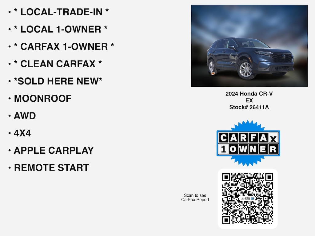 Please call 419-740-4925 anytime! for more info on this certified 2024 Honda CR-V EX car for sale. This vehicle is loaded with distinguished features like * CARFAX 1-OWNER *, * CLEAN CARFAX *, * LOCAL-TRADE-IN *, * LOCAL 1-OWNER *, *SOLD HERE NEW*, AWD, MOONROOF, 4X4, REMOTE START, HEATED SEATS, APPLE CARPLAY, LANE-DEPARTURE WARNING, ANDROID AUTO, TURBO, ALLOY-WHEELS, REAR A/C, BLIND SPOT MONITORING, BACKUP CAMERA, BLUETOOTH, usb, Remote entry that Toledo and Perrysburg drivers appreciate.