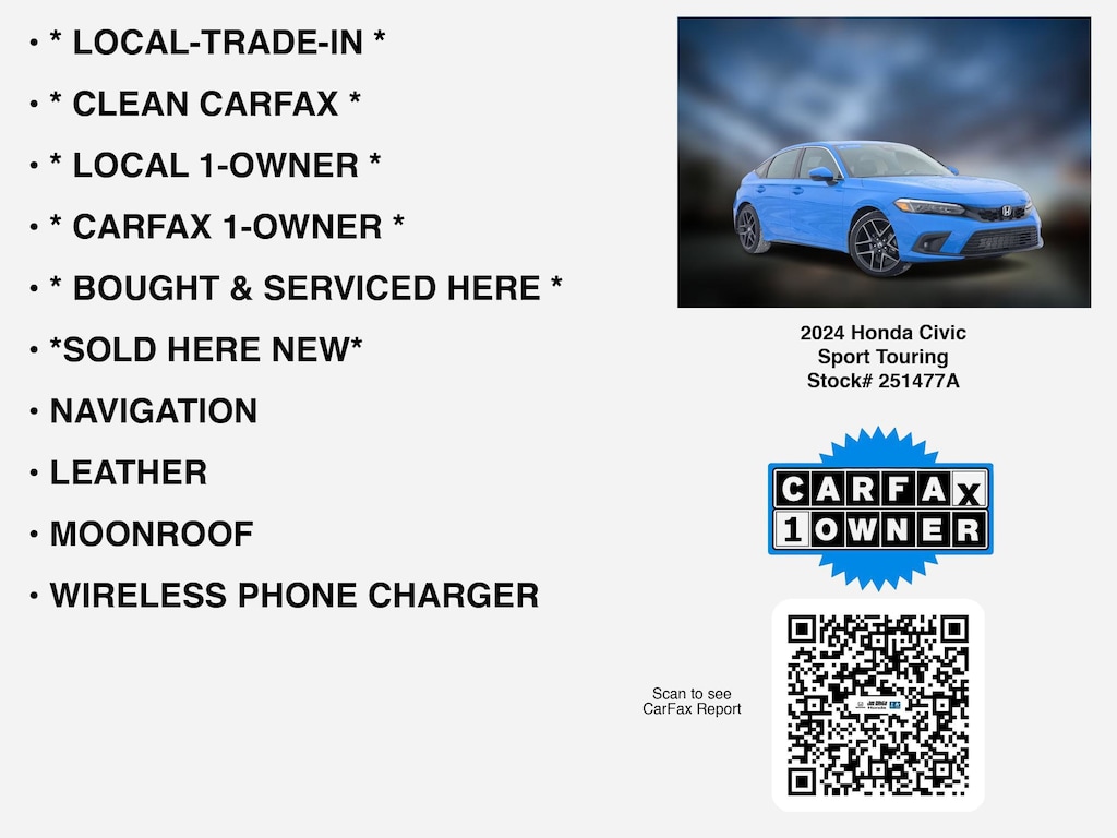 Please call 419-740-4925 anytime! for more info on this certified 2024 Honda Civic Sport Touring.This car is equipped with premium features like * BOUGHT & SERVICED HERE *, * CLEAN CARFAX *, * CARFAX 1-OWNER *, * LOCAL-TRADE-IN *, * LOCAL 1-OWNER *, *SOLD HERE NEW*, LEATHER, MOONROOF, NAVIGATION, REMOTE START, APPLE CARPLAY, WIRELESS PHONE CHARGER, LANE-DEPARTURE WARNING, ANDROID AUTO, BACKUP CAMERA, BLIND SPOT MONITORING, ALLOY-WHEELS, TURBO, HOMELINK, BLUETOOTH, BACKUP-SENSORS, usb, Fog Lamps, SiriusXM, Dual Power Seats, Remote entry that Toledo and Perrysburg drivers prefer.