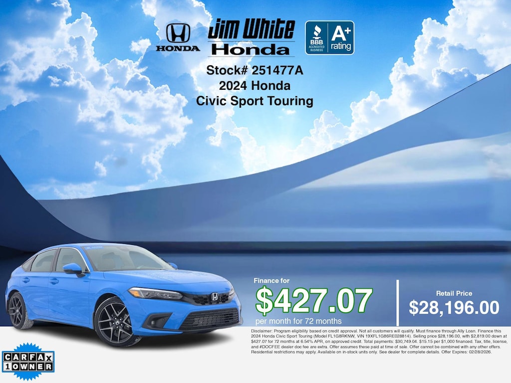 Disclaimer: Disclaimer: Program eligibility based on credit approval. Not all customers will qualify. Must finance through Ally Loan. Finance this 2024 Honda Civic Sport Touring (Model FL1G8RKNW, VIN 19XFL1G86RE028814). Selling price $28,196.00, with $2,819.00 down at $427.07 for 72 months at 6.54% APR, on approved credit. Total payments: $30,749.04. $15.15 per $1,000 financed. Tax, title, license, and #DOCFEE dealer doc fee are extra. Offer assumes these paid at time of sale. Offer cannot be combined with any other offers. Residential restrictions may apply. Available on in-stock units only. See dealer for complete details. Offer Expires: 02/28/2026.
