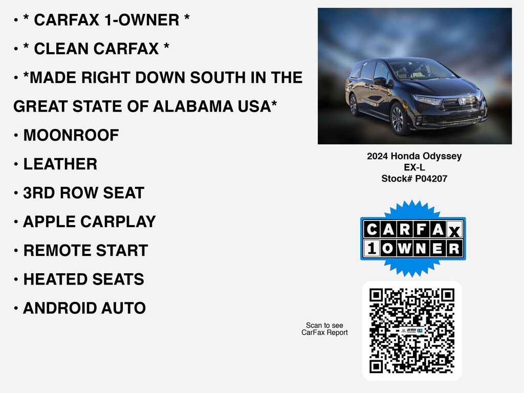 Please call 419-740-4925 anytime! for more info on this certified 2024 Honda Odyssey EX-L car for sale. This vehicle is loaded with distinguished features like * CLEAN CARFAX *, * CARFAX 1-OWNER *, *MADE RIGHT DOWN SOUTH IN THE GREAT STATE OF ALABAMA USA*, LEATHER, MOONROOF, APPLE CARPLAY, 3RD ROW SEAT, HEATED SEATS, REMOTE START, LANE-DEPARTURE WARNING, ANDROID AUTO, HOMELINK, POWER REAR LIFT GATE, BACKUP CAMERA, ALLOY-WHEELS, BLIND SPOT MONITORING, STOW "N GO, BLUETOOTH, POWER SLIDING DOORS, GREAT COLOR COMBINATION, Fog Lamps, usb, SiriusXM, Remote entry, Dual Power Seats that Toledo and Perrysburg drivers appreciate.