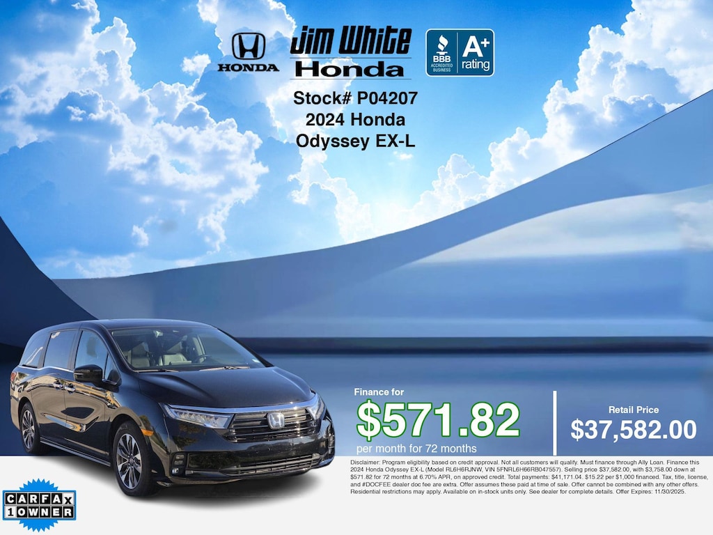 Disclaimer: Disclaimer: Program eligibility based on credit approval. Not all customers will qualify. Must finance through Ally Loan. Finance this 2024 Honda Odyssey EX-L (Model RL6H6RJNW, VIN 5FNRL6H66RB047557). Selling price $37,582.00, with $3,758.00 down at $571.82 for 72 months at 6.70% APR, on approved credit. Total payments: $41,171.04. $15.22 per $1,000 financed. Tax, title, license, and #DOCFEE dealer doc fee are extra. Offer assumes these paid at time of sale. Offer cannot be combined with any other offers. Residential restrictions may apply. Available on in-stock units only. See dealer for complete details. Offer Expires: 11/30/2025.