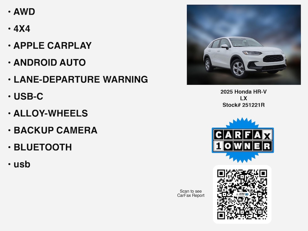 Please call 419-740-4925 anytime! for more info on this certified 2025 Honda HR-V LX.This car is equipped with premium features like 4X4, AWD, APPLE CARPLAY, LANE-DEPARTURE WARNING, ANDROID AUTO, USB-C, BACKUP CAMERA, ALLOY-WHEELS, BLUETOOTH, Remote entry, usb that Toledo and Perrysburg drivers prefer.