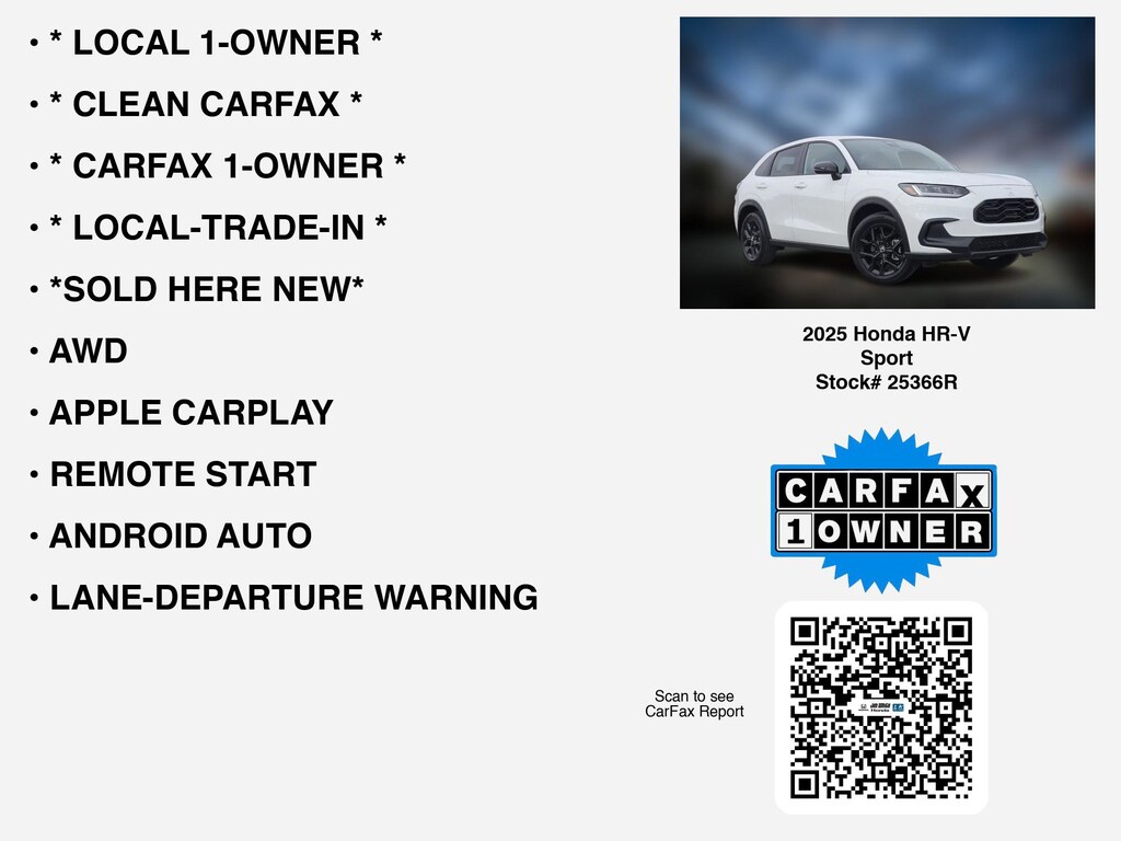 Please call 419-740-4925 anytime! for more info on this certified 2025 Honda HR-V Sport car for sale. This vehicle is loaded with distinguished features like * CARFAX 1-OWNER *, * CLEAN CARFAX *, * LOCAL 1-OWNER *, * LOCAL-TRADE-IN *, *SOLD HERE NEW*, BETTER THAN NEW WARRANTY! AWD, REMOTE START, APPLE CARPLAY, ANDROID AUTO, LANE-DEPARTURE WARNING, ALLOY-WHEELS, BACKUP CAMERA, BLIND SPOT MONITORING, BLUETOOTH, Remote entry, usb that Toledo and Perrysburg drivers appreciate.