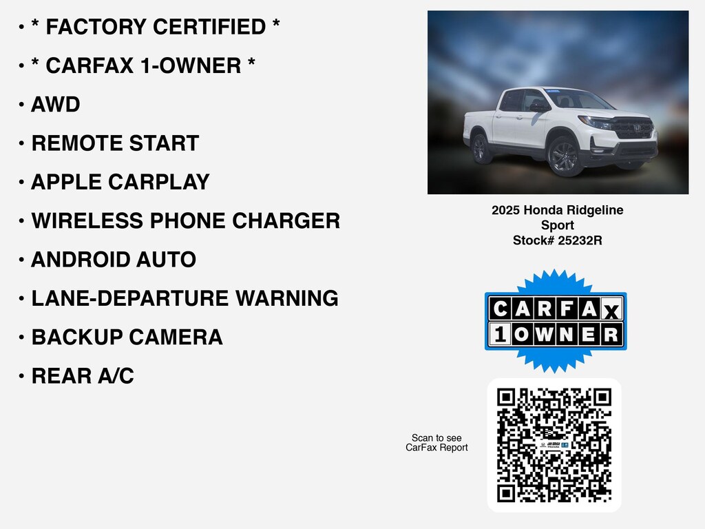Please call 419-740-4925 anytime! for more info on this certified 2025 Honda Ridgeline Sport car for sale. RARE OPPORTUNITY TO GET A BETTER WARRANTY THAN A NEW ONE***BUMPER TO BUMPER WARRANTY TO 86,000 MILES AND ENGINE/DRIVETRAIN TO 100,000 MILES. This vehicle is loaded with distinguished features like * FACTORY CERTIFIED *, * CARFAX 1-OWNER *, AWD, APPLE CARPLAY, WIRELESS PHONE CHARGER, REMOTE START, ANDROID AUTO, LANE-DEPARTURE WARNING, ALLOY-WHEELS, REAR A/C, BACKUP CAMERA, BED-LINER, BLIND SPOT MONITORING, BLUETOOTH, CLEAN CARFAX, WiFi Hotspot, Remote entry, Fog Lamps, usb that Toledo and Perrysburg drivers appreciate.
