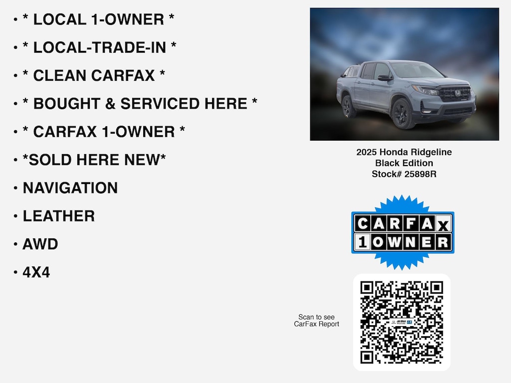 Please call 419-740-4925 anytime! for more info on this certified 2025 Honda Ridgeline Black Edition car for sale. This vehicle is loaded with distinguished features like * CARFAX 1-OWNER *, * LOCAL-TRADE-IN *, * BOUGHT & SERVICED HERE *, * LOCAL 1-OWNER *, * CLEAN CARFAX *, *SOLD HERE NEW*, LEATHER, AWD, 4X4, NAVIGATION, APPLE CARPLAY, WIRELESS PHONE CHARGER, HEATED SEATS, COOLED SEATS, REMOTE START, TOW PKG, LANE-DEPARTURE WARNING, ANDROID AUTO, HEATED-REAR SEATS, BLIND SPOT MONITORING, REAR A/C, HEATED-STEERING WHEEL, ALLOY-WHEELS, BACKUP CAMERA, BED-LINER, BLUETOOTH, WiFi Hotspot, Remote entry, Fog Lamps, Dual Power Seats, usb, SiriusXM that Toledo and Perrysburg drivers appreciate.
