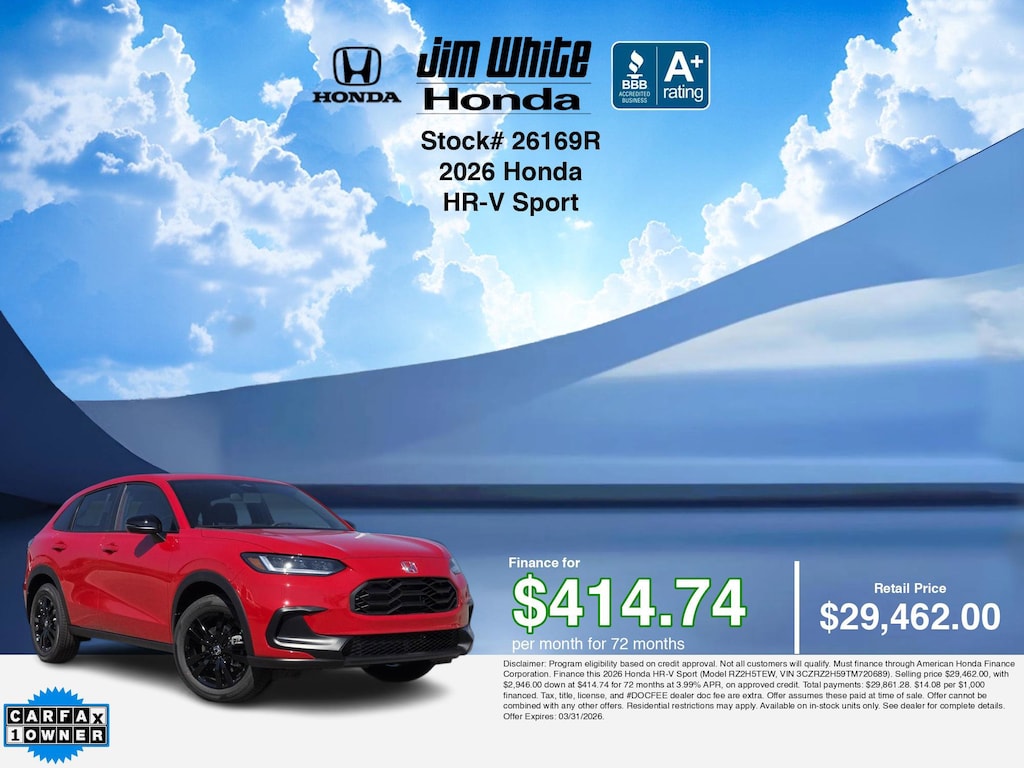 Disclaimer: Disclaimer: Program eligibility based on credit approval. Not all customers will qualify. Must finance through American Honda Finance Corporation. Finance this 2026 Honda HR-V Sport (Model RZ2H5TEW, VIN 3CZRZ2H59TM720689). Selling price $29,462.00, with $2,946.00 down at $414.74 for 72 months at 3.99% APR, on approved credit. Total payments: $29,861.28. $14.08 per $1,000 financed. Tax, title, license, and #DOCFEE dealer doc fee are extra. Offer assumes these paid at time of sale. Offer cannot be combined with any other offers. Residential restrictions may apply. Available on in-stock units only. See dealer for complete details. Offer Expires: 03/31/2026.