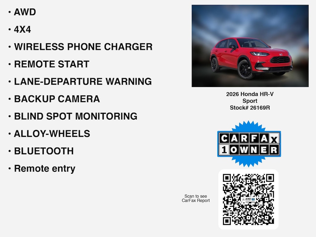 Please call 419-740-4925 anytime! for more info on this certified 2026 Honda HR-V Sport.This car is equipped with premium features like 4X4, AWD, REMOTE START, WIRELESS PHONE CHARGER, LANE-DEPARTURE WARNING, ALLOY-WHEELS, BLIND SPOT MONITORING, BACKUP CAMERA, BLUETOOTH, Remote entry, usb that Toledo and Perrysburg drivers prefer.