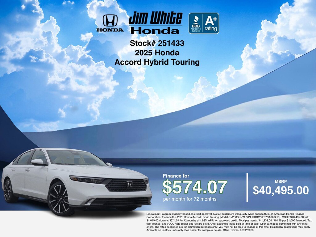 Our car payment calculator and estimator tools can help you understand these finance offers that leverage the benefits of Honda Financial Services, along with Honda vehicle incentives right now and current Honda Accord Hybrid Touring specials. Additionally, we offer 2 other Accord Hybrid Touring options for the best selection in Maumee. Call or drive in for Honda finance deals you can drive home today! Disclaimer: Disclaimer: Program eligibility based on credit approval. Not all customers will qualify. Must finance through American Honda Finance Corporation. Finance this 2025 Honda Accord Hybrid Touring (Model CY2F8SKNW, VIN 1HGCY2F87SA076215). MSRP $40,495.00 with $4,049.00 down at $574.07 for 72 months at 4.99% APR, on approved credit. Total payments: $41,333.04. $14.46 per $1,000 financed. Tax, title, license, and #DOCFEE dealer doc fee are extra. Offer assumes these paid at time of sale. Offer cannot be combined with any other offers. The rates described are for estimation purposes only; you may not be able to finance at this rate. Residential restrictions may apply. Available on in-stock units only. See dealer for complete details. Offer Expires: 03/02/2026.
