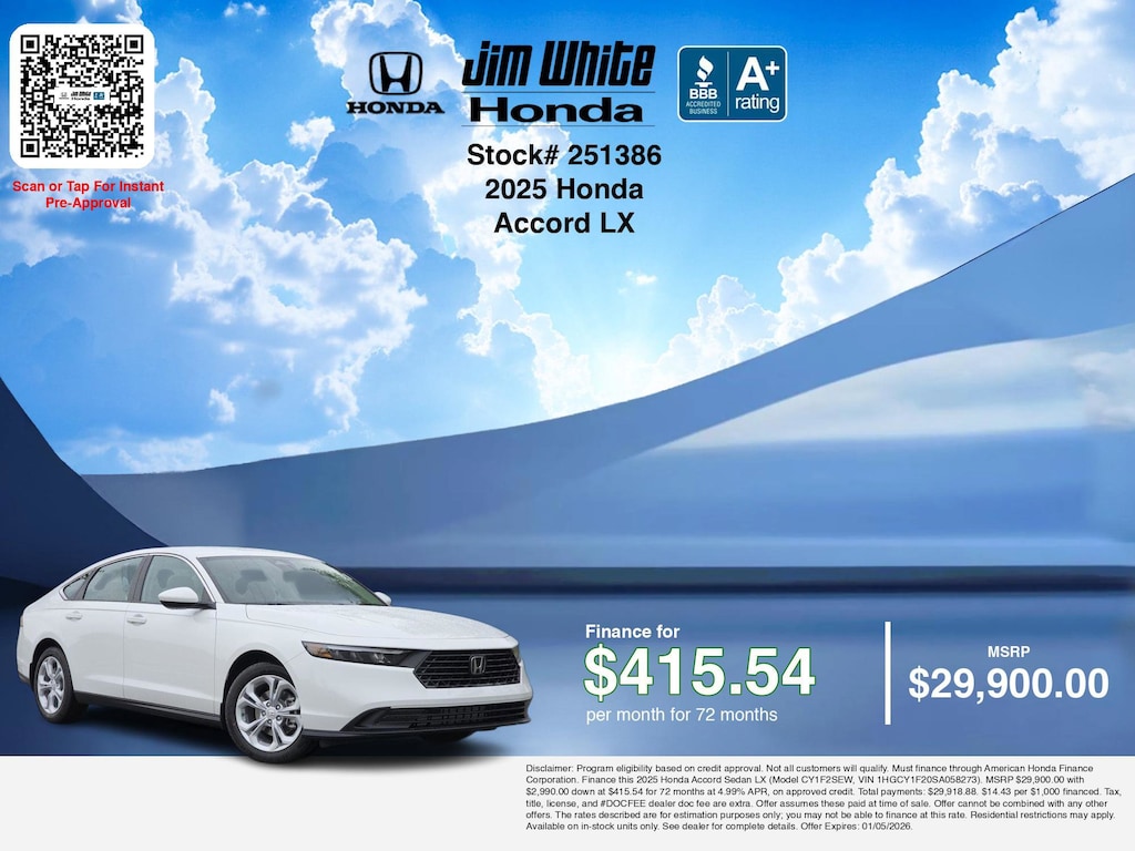 If you are ready to finance a new Honda near Maumee, Toledo, Perrysburg, and Waterville, Jim White Honda is thrilled to offer you competitive finance deals on this 2025 Honda Accord LX. Here is how the monthly payment of $415.54 is calculated for well-qualified buyers shopping Jim White Honda with Tier 1 credit (use our car loan payment calculator or monthly car payment calculator for estimates):