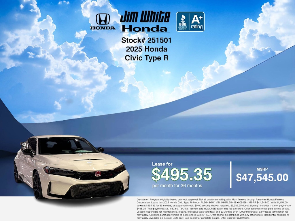 These offers leverage the benefits of Honda Financial Services, along with current Honda incentives, Honda Civic Type R specials, and tax incentives available on electric vehicles. Additionally, we offer 2 other Civic Type R options for the best selection in Maumee. Call or drive in for competitive Honda lease offers you can drive home today, like this stunning 2025 Honda Civic Type R with lease options near Maumee! This Civic Type R is also available for sale near Toledo, Perrysburg, and Waterville. These Honda lease specials end 3/2/2026 Disclaimer: Disclaimer: Program eligibility based on credit approval. Not all customers will qualify. Must finance through American Honda Finance Corporation. Lease this 2025 Honda Civic Type R (Model FL5G4SGW; VIN JHMFL5G44SX009428). MSRP $47,545.00. With $4,754.00 down at $495.35 for 36 months, on approved credit. $0.00 security deposit required. $5,249.35 due at signing - includes 1st mo. payment of $495.35. Total payments: $17,832.60. Tax, title, license, and #DOCFEE dealer doc fee are extra. Offer assumes these paid at time of sale. Lessee responsible for maintenance, repairs, excessive wear and tear, and $0.20/mile over 10000 miles/year. Early lease termination fee may apply. Option to purchase vehicle at lease end is $33,281.50. Offer cannot be combined with any other offers. Residential restrictions may apply. Available on in-stock units only. See dealer for complete details. Offer Expires: 03/02/2026.