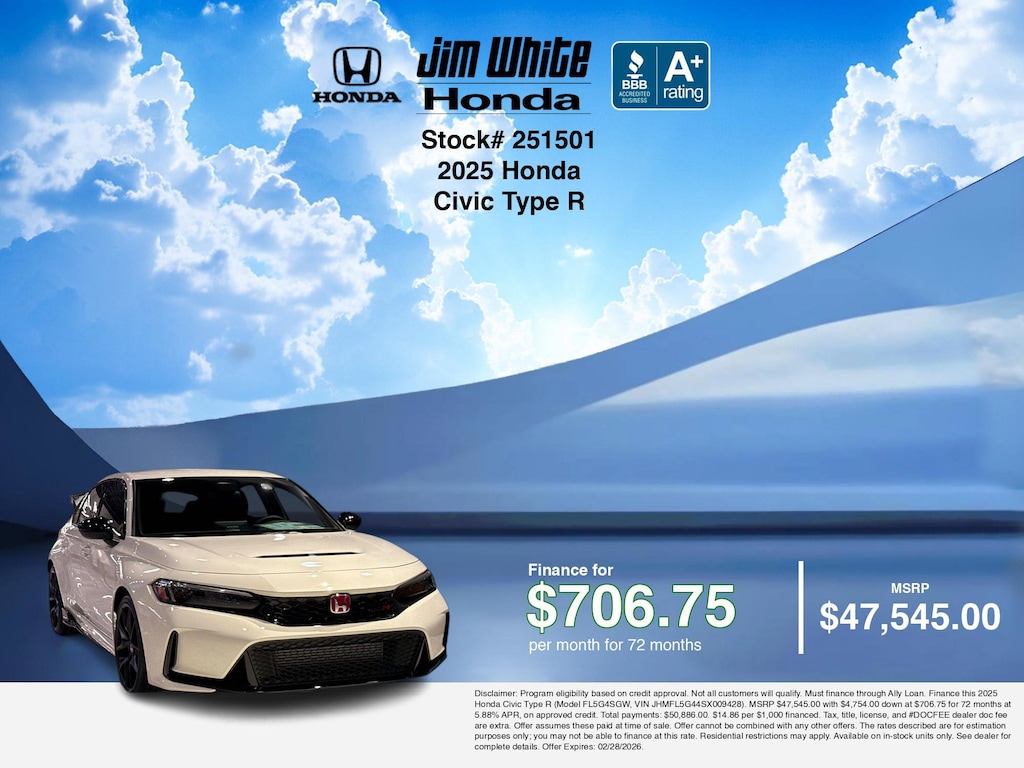 If you are ready to finance a new Honda near Maumee, Toledo, Perrysburg, and Waterville, Jim White Honda is thrilled to offer you competitive finance deals on this 2025 Honda Civic Type R . Here is how the monthly payment of $706.75 is calculated for well-qualified buyers shopping Jim White Honda with Tier 1 credit (use our car loan payment calculator or monthly car payment calculator for estimates):