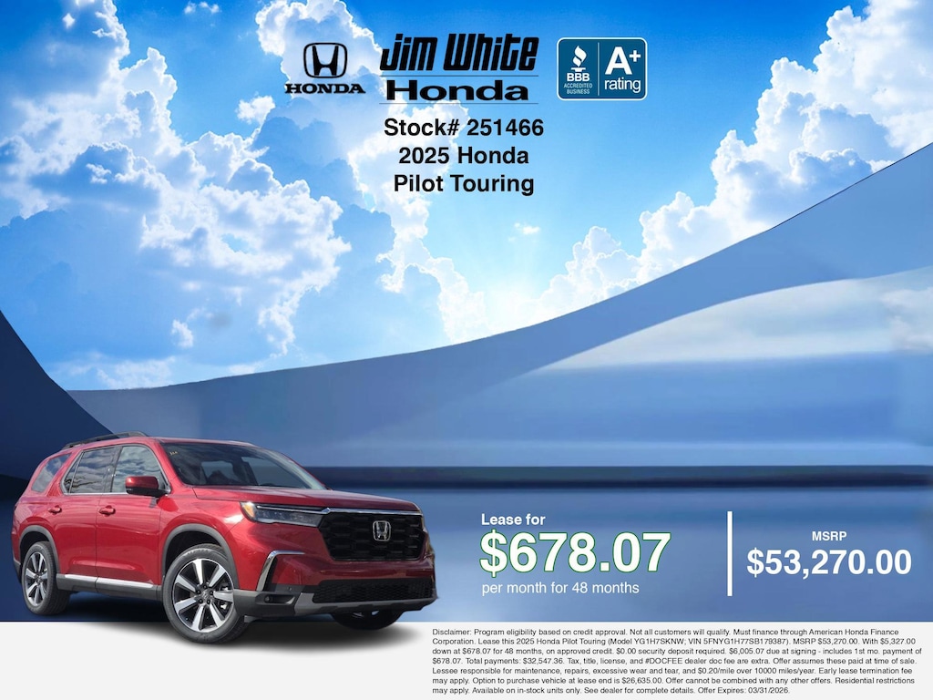 These offers leverage the benefits of Honda Financial Services, along with current Honda incentives, Honda Pilot Touring specials, and tax incentives available on electric vehicles. Additionally, we offer 11 other Pilot Touring options for the best selection in Maumee. Call or drive in for competitive Honda lease offers you can drive home today, like this stunning 2025 Honda Pilot with lease options near Maumee! This Pilot is also available for sale near Toledo, Perrysburg, and Waterville. These Honda lease specials end 3/31/2026 Disclaimer: Disclaimer: Program eligibility based on credit approval. Not all customers will qualify. Must finance through American Honda Finance Corporation. Lease this 2025 Honda Pilot Touring (Model YG1H7SKNW; VIN 5FNYG1H77SB179387). MSRP $53,270.00. With $5,327.00 down at $678.07 for 48 months, on approved credit. $0.00 security deposit required. $6,005.07 due at signing - includes 1st mo. payment of $678.07. Total payments: $32,547.36. Tax, title, license, and #DOCFEE dealer doc fee are extra. Offer assumes these paid at time of sale. Lessee responsible for maintenance, repairs, excessive wear and tear, and $0.20/mile over 10000 miles/year. Early lease termination fee may apply. Option to purchase vehicle at lease end is $26,635.00. Offer cannot be combined with any other offers. Residential restrictions may apply. Available on in-stock units only. See dealer for complete details. Offer Expires: 03/31/2026.