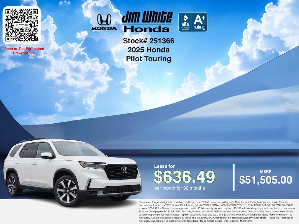 These offers leverage the benefits of Honda Financial Services, along with current Honda incentives, Honda Pilot Touring specials, and tax incentives available on electric vehicles. Additionally, we offer 4 other Pilot Touring options for the best selection in Maumee. Call or drive in for competitive Honda lease offers you can drive home today, like this stunning 2025 Honda Pilot with lease options near Maumee! This Pilot is also available for sale near Toledo, Perrysburg, and Waterville. These Honda lease specials end 11/3/2025 Disclaimer: Disclaimer: Program eligibility based on credit approval. Not all customers will qualify. Must finance through American Honda Finance Corporation. Lease this 2025 Honda Pilot Touring (Model YG1H7SKNW; VIN 5FNYG1H75SB151619). MSRP $51,505.00. With $5,150.00 down at $636.49 for 36 months, on approved credit. $0.00 security deposit required. $5,786.49 due at signing - includes 1st mo. payment of $636.49. Total payments: $22,913.64. Tax, title, license, and #DOCFEE dealer doc fee are extra. Offer assumes these paid at time of sale. Lessee responsible for maintenance, repairs, excessive wear and tear, and $0.20/mile over 10000 miles/year. Early lease termination fee may apply. Option to purchase vehicle at lease end is $30,903.00. Offer cannot be combined with any other offers. Residential restrictions may apply. Available on in-stock units only. See dealer for complete details. Offer Expires: 11/03/2025.