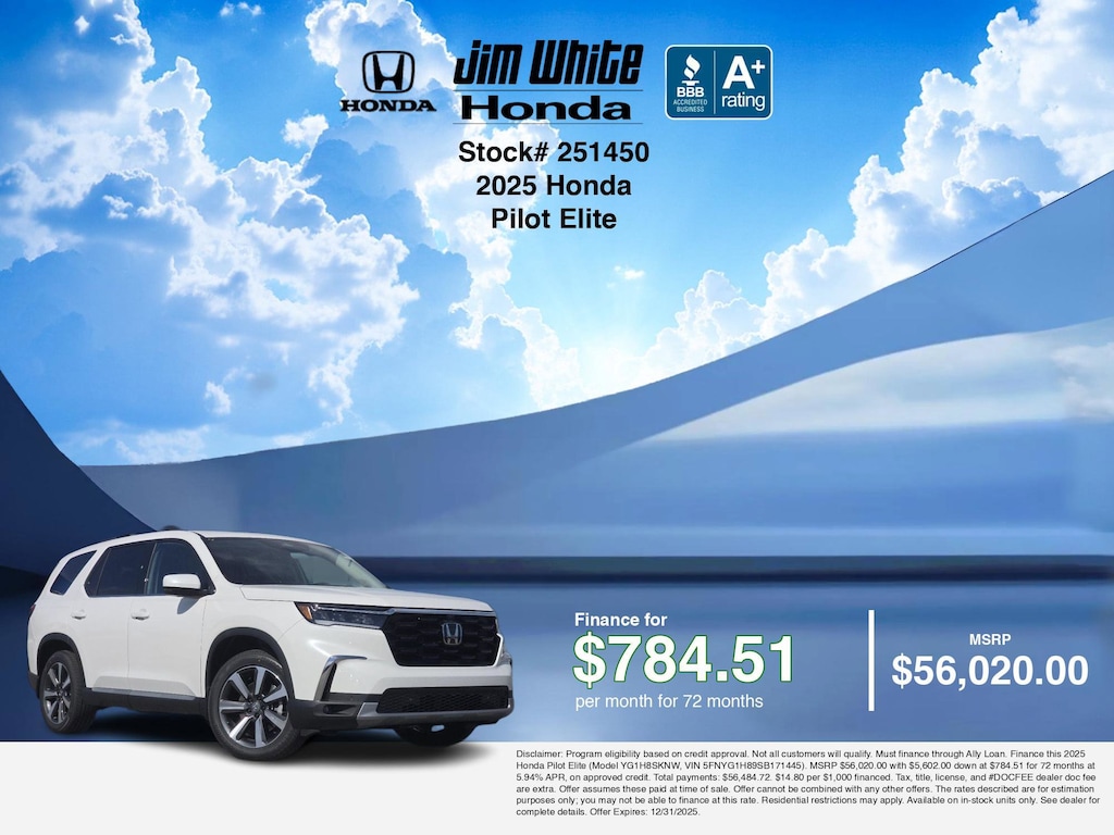 Our car payment calculator and estimator tools can help you understand these finance offers that leverage the benefits of Honda Financial Services, along with Honda vehicle incentives right now and current Honda Pilot Elite specials. Additionally, we offer 4 other Pilot Elite options for the best selection in Maumee. Call or drive in for Honda finance deals you can drive home today! Disclaimer: Disclaimer: Program eligibility based on credit approval. Not all customers will qualify. Must finance through Ally Loan. Finance this 2025 Honda Pilot Elite (Model YG1H8SKNW, VIN 5FNYG1H89SB171445). MSRP $56,020.00 with $5,602.00 down at $784.51 for 72 months at 5.94% APR, on approved credit. Total payments: $56,484.72. $14.80 per $1,000 financed. Tax, title, license, and #DOCFEE dealer doc fee are extra. Offer assumes these paid at time of sale. Offer cannot be combined with any other offers. The rates described are for estimation purposes only; you may not be able to finance at this rate. Residential restrictions may apply. Available on in-stock units only. See dealer for complete details. Offer Expires: 12/31/2025.