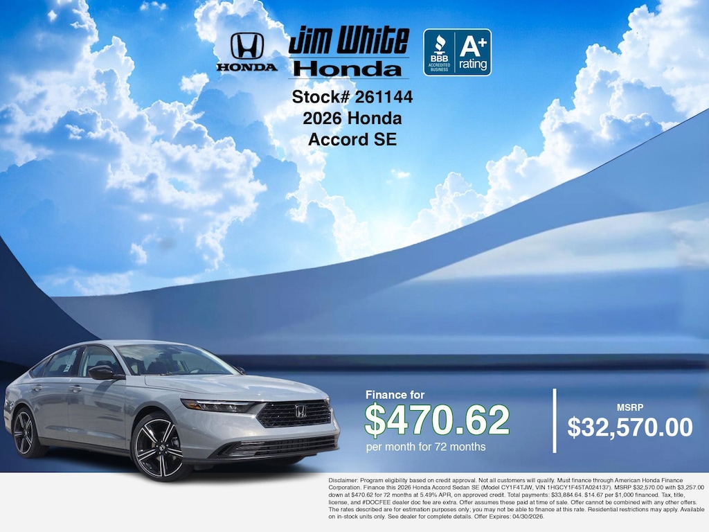 These offers leverage the benefits of Honda Financial Services, along with current Honda incentives, Honda Accord SE specials, and tax incentives available on electric vehicles. Additionally, we offer 9 other Accord SE options for the best selection in Maumee. Call or drive in for competitive Honda lease offers you can drive home today, like this stunning 2026 Honda Accord with lease options near Maumee! This Accord is also available for sale near Toledo, Perrysburg, and Waterville. These Honda lease specials end 4/30/2026 Disclaimer: Disclaimer: Program eligibility based on credit approval. Not all customers will qualify. Must finance through American Honda Finance Corporation. Lease this 2026 Honda Accord Sedan SE (Model CY1F4TJW; VIN 1HGCY1F45TA024137). MSRP $32,570.00. With $3,257.00 down at $387.41 for 36 months, on approved credit. $0.00 security deposit required. $3,644.41 due at signing - includes 1st mo. payment of $387.41. Total payments: $13,946.76. Tax, title, license, and #DOCFEE dealer doc fee are extra. Offer assumes these paid at time of sale. Lessee responsible for maintenance, repairs, excessive wear and tear, and $0.20/mile over 10000 miles/year. Early lease termination fee may apply. Option to purchase vehicle at lease end is $19,867.70. Offer cannot be combined with any other offers. Residential restrictions may apply. Available on in-stock units only. See dealer for complete details. Offer Expires: 04/30/2026.