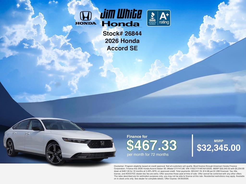 These offers leverage the benefits of Honda Financial Services, along with current Honda incentives, Honda Accord SE specials, and tax incentives available on electric vehicles. Additionally, we offer 8 other Accord SE options for the best selection in Maumee. Call or drive in for competitive Honda lease offers you can drive home today, like this stunning 2026 Honda Accord with lease options near Maumee! This Accord is also available for sale near Toledo, Perrysburg, and Waterville. These Honda lease specials end 4/30/2026 Disclaimer: Disclaimer: Program eligibility based on credit approval. Not all customers will qualify. Must finance through American Honda Finance Corporation. Lease this 2026 Honda Accord Sedan SE (Model CY1F4TJW; VIN 1HGCY1F48TA010359). MSRP $32,345.00. With $3,234.00 down at $384.87 for 36 months, on approved credit. $0.00 security deposit required. $3,618.87 due at signing - includes 1st mo. payment of $384.87. Total payments: $13,855.32. Tax, title, license, and #DOCFEE dealer doc fee are extra. Offer assumes these paid at time of sale. Lessee responsible for maintenance, repairs, excessive wear and tear, and $0.20/mile over 10000 miles/year. Early lease termination fee may apply. Option to purchase vehicle at lease end is $19,730.45. Offer cannot be combined with any other offers. Residential restrictions may apply. Available on in-stock units only. See dealer for complete details. Offer Expires: 04/30/2026.
