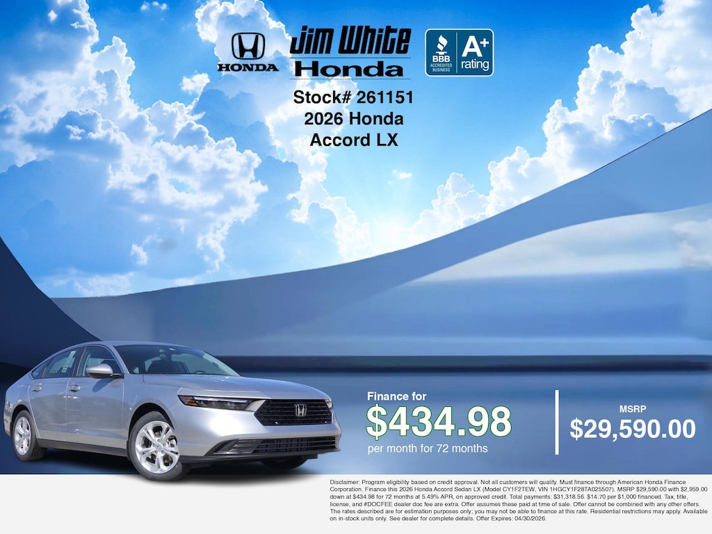 Our car payment calculator and estimator tools can help you understand these finance offers that leverage the benefits of Honda Financial Services, along with Honda vehicle incentives right now and current Honda Accord LX specials. Additionally, we offer 5 other Accord LX options for the best selection in Maumee. Call or drive in for Honda finance deals you can drive home today! Disclaimer: Disclaimer: Program eligibility based on credit approval. Not all customers will qualify. Must finance through American Honda Finance Corporation. Finance this 2026 Honda Accord Sedan LX (Model CY1F2TEW, VIN 1HGCY1F28TA025507). MSRP $29,590.00 with $2,959.00 down at $434.98 for 72 months at 5.49% APR, on approved credit. Total payments: $31,318.56. $14.70 per $1,000 financed. Tax, title, license, and #DOCFEE dealer doc fee are extra. Offer assumes these paid at time of sale. Offer cannot be combined with any other offers. The rates described are for estimation purposes only; you may not be able to finance at this rate. Residential restrictions may apply. Available on in-stock units only. See dealer for complete details. Offer Expires: 04/30/2026.