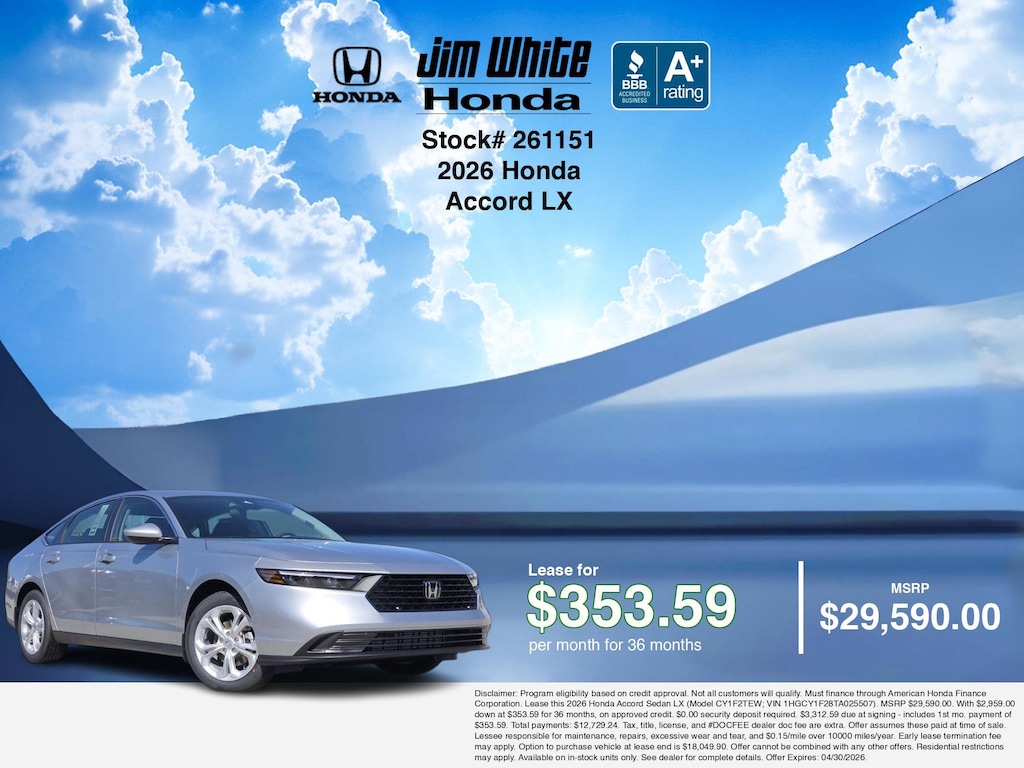 These offers leverage the benefits of Honda Financial Services, along with current Honda incentives, Honda Accord LX specials, and tax incentives available on electric vehicles. Additionally, we offer 5 other Accord LX options for the best selection in Maumee. Call or drive in for competitive Honda lease offers you can drive home today, like this stunning 2026 Honda Accord with lease options near Maumee! This Accord is also available for sale near Toledo, Perrysburg, and Waterville. These Honda lease specials end 4/30/2026 Disclaimer: Disclaimer: Program eligibility based on credit approval. Not all customers will qualify. Must finance through American Honda Finance Corporation. Lease this 2026 Honda Accord Sedan LX (Model CY1F2TEW; VIN 1HGCY1F28TA025507). MSRP $29,590.00. With $2,959.00 down at $353.59 for 36 months, on approved credit. $0.00 security deposit required. $3,312.59 due at signing - includes 1st mo. payment of $353.59. Total payments: $12,729.24. Tax, title, license, and #DOCFEE dealer doc fee are extra. Offer assumes these paid at time of sale. Lessee responsible for maintenance, repairs, excessive wear and tear, and $0.15/mile over 10000 miles/year. Early lease termination fee may apply. Option to purchase vehicle at lease end is $18,049.90. Offer cannot be combined with any other offers. Residential restrictions may apply. Available on in-stock units only. See dealer for complete details. Offer Expires: 04/30/2026.