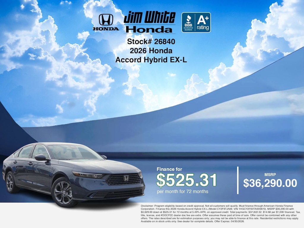 These offers leverage the benefits of Honda Financial Services, along with current Honda incentives, Honda Accord Hybrid EX-L specials, and tax incentives available on electric vehicles. Additionally, we offer 5 other Accord Hybrid EX-L options for the best selection in Maumee. Call or drive in for competitive Honda lease offers you can drive home today, like this stunning 2026 Honda Accord Hybrid with lease options near Maumee! This Accord Hybrid is also available for sale near Toledo, Perrysburg, and Waterville. These Honda lease specials end 4/30/2026 Disclaimer: Disclaimer: Program eligibility based on credit approval. Not all customers will qualify. Must finance through American Honda Finance Corporation. Lease this 2026 Honda Accord Hybrid EX-L (Model CY2F6TJNW; VIN 1HGCY2F60TA000870). MSRP $36,290.00. With $3,629.00 down at $422.56 for 36 months, on approved credit. $0.00 security deposit required. $4,051.56 due at signing - includes 1st mo. payment of $422.56. Total payments: $15,212.16. Tax, title, license, and #DOCFEE dealer doc fee are extra. Offer assumes these paid at time of sale. Lessee responsible for maintenance, repairs, excessive wear and tear, and $0.20/mile over 10000 miles/year. Early lease termination fee may apply. Option to purchase vehicle at lease end is $22,499.80. Offer cannot be combined with any other offers. Residential restrictions may apply. Available on in-stock units only. See dealer for complete details. Offer Expires: 04/30/2026.