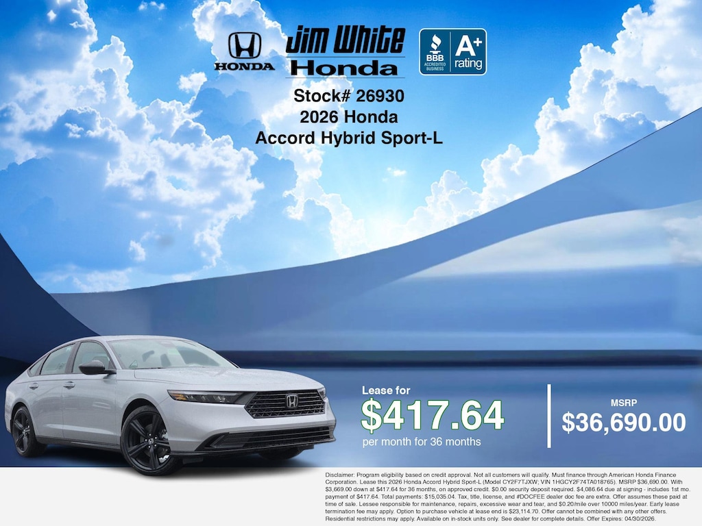 These offers leverage the benefits of Honda Financial Services, along with current Honda incentives, Honda Accord Hybrid Sport-L specials, and tax incentives available on electric vehicles. Additionally, we offer 4 other Accord Hybrid Sport-L options for the best selection in Maumee. Call or drive in for competitive Honda lease offers you can drive home today, like this stunning 2026 Honda Accord Hybrid with lease options near Maumee! This Accord Hybrid is also available for sale near Toledo, Perrysburg, and Waterville. These Honda lease specials end 4/30/2026 Disclaimer: Disclaimer: Program eligibility based on credit approval. Not all customers will qualify. Must finance through American Honda Finance Corporation. Lease this 2026 Honda Accord Hybrid Sport-L (Model CY2F7TJXW; VIN 1HGCY2F74TA018765). MSRP $36,690.00. With $3,669.00 down at $417.64 for 36 months, on approved credit. $0.00 security deposit required. $4,086.64 due at signing - includes 1st mo. payment of $417.64. Total payments: $15,035.04. Tax, title, license, and #DOCFEE dealer doc fee are extra. Offer assumes these paid at time of sale. Lessee responsible for maintenance, repairs, excessive wear and tear, and $0.20/mile over 10000 miles/year. Early lease termination fee may apply. Option to purchase vehicle at lease end is $23,114.70. Offer cannot be combined with any other offers. Residential restrictions may apply. Available on in-stock units only. See dealer for complete details. Offer Expires: 04/30/2026.