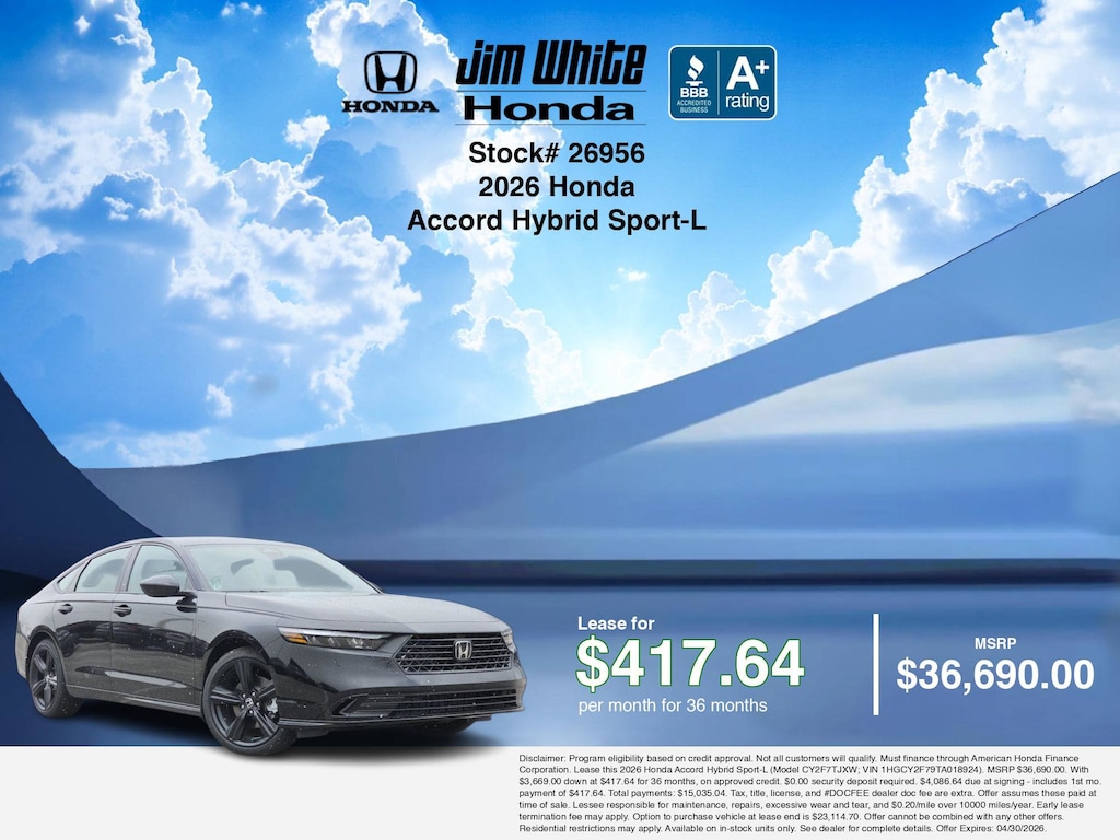 These offers leverage the benefits of Honda Financial Services, along with current Honda incentives, Honda Accord Hybrid Sport-L specials, and tax incentives available on electric vehicles. Additionally, we offer 4 other Accord Hybrid Sport-L options for the best selection in Maumee. Call or drive in for competitive Honda lease offers you can drive home today, like this stunning 2026 Honda Accord Hybrid with lease options near Maumee! This Accord Hybrid is also available for sale near Toledo, Perrysburg, and Waterville. These Honda lease specials end 4/30/2026 Disclaimer: Disclaimer: Program eligibility based on credit approval. Not all customers will qualify. Must finance through American Honda Finance Corporation. Lease this 2026 Honda Accord Hybrid Sport-L (Model CY2F7TJXW; VIN 1HGCY2F79TA018924). MSRP $36,690.00. With $3,669.00 down at $417.64 for 36 months, on approved credit. $0.00 security deposit required. $4,086.64 due at signing - includes 1st mo. payment of $417.64. Total payments: $15,035.04. Tax, title, license, and #DOCFEE dealer doc fee are extra. Offer assumes these paid at time of sale. Lessee responsible for maintenance, repairs, excessive wear and tear, and $0.20/mile over 10000 miles/year. Early lease termination fee may apply. Option to purchase vehicle at lease end is $23,114.70. Offer cannot be combined with any other offers. Residential restrictions may apply. Available on in-stock units only. See dealer for complete details. Offer Expires: 04/30/2026.