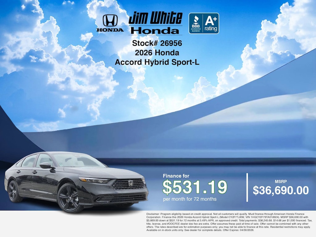 If you are ready to finance a new Honda near Maumee, Toledo, Perrysburg, and Waterville, Jim White Honda is thrilled to offer you competitive finance deals on this 2026 Honda Accord Hybrid Sport-L. Here is how the monthly payment of $531.19 is calculated for well-qualified buyers shopping Jim White Honda with Tier 1 credit (use our car loan payment calculator or monthly car payment calculator for estimates):