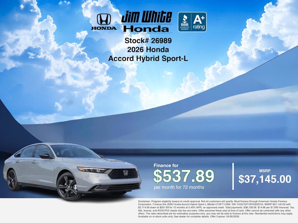 These offers leverage the benefits of Honda Financial Services, along with current Honda incentives, Honda Accord Hybrid Sport-L specials, and tax incentives available on electric vehicles. Additionally, we offer 5 other Accord Hybrid Sport-L options for the best selection in Maumee. Call or drive in for competitive Honda lease offers you can drive home today, like this stunning 2026 Honda Accord Hybrid with lease options near Maumee! This Accord Hybrid is also available for sale near Toledo, Perrysburg, and Waterville. These Honda lease specials end 4/30/2026 Disclaimer: Disclaimer: Program eligibility based on credit approval. Not all customers will qualify. Must finance through American Honda Finance Corporation. Lease this 2026 Honda Accord Hybrid Sport-L (Model CY2F7TJXW; VIN 1HGCY2F78TA022074). MSRP $37,145.00. With $3,714.00 down at $422.62 for 36 months, on approved credit. $0.00 security deposit required. $4,136.62 due at signing - includes 1st mo. payment of $422.62. Total payments: $15,214.32. Tax, title, license, and #DOCFEE dealer doc fee are extra. Offer assumes these paid at time of sale. Lessee responsible for maintenance, repairs, excessive wear and tear, and $0.20/mile over 10000 miles/year. Early lease termination fee may apply. Option to purchase vehicle at lease end is $23,401.35. Offer cannot be combined with any other offers. Residential restrictions may apply. Available on in-stock units only. See dealer for complete details. Offer Expires: 04/30/2026.