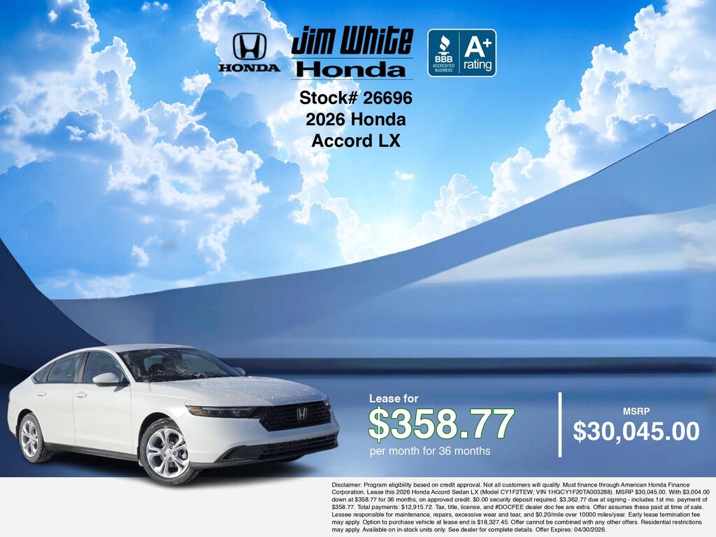 These offers leverage the benefits of Honda Financial Services, along with current Honda incentives, Honda Accord LX specials, and tax incentives available on electric vehicles. Additionally, we offer 4 other Accord LX options for the best selection in Maumee. Call or drive in for competitive Honda lease offers you can drive home today, like this stunning 2026 Honda Accord with lease options near Maumee! This Accord is also available for sale near Toledo, Perrysburg, and Waterville. These Honda lease specials end 4/30/2026 Disclaimer: Disclaimer: Program eligibility based on credit approval. Not all customers will qualify. Must finance through American Honda Finance Corporation. Lease this 2026 Honda Accord Sedan LX (Model CY1F2TEW; VIN 1HGCY1F20TA003288). MSRP $30,045.00. With $3,004.00 down at $358.77 for 36 months, on approved credit. $0.00 security deposit required. $3,362.77 due at signing - includes 1st mo. payment of $358.77. Total payments: $12,915.72. Tax, title, license, and #DOCFEE dealer doc fee are extra. Offer assumes these paid at time of sale. Lessee responsible for maintenance, repairs, excessive wear and tear, and $0.20/mile over 10000 miles/year. Early lease termination fee may apply. Option to purchase vehicle at lease end is $18,327.45. Offer cannot be combined with any other offers. Residential restrictions may apply. Available on in-stock units only. See dealer for complete details. Offer Expires: 04/30/2026.